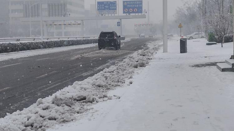 2月4日,武汉强降雪中,汽车缓慢通行。