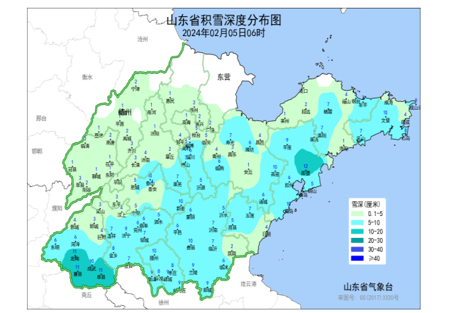截至2月5日6时,降雪地区出现较明显积雪,其中,青岛即墨12厘米、菏泽定陶11厘米、曹县11厘米、单县11厘米。