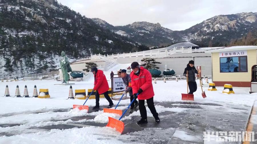 根据昨夜降雪情况,今晨6点30分,仰口管理服务中心启动除雪应急预案,组织中心值班员及附近工作人员40余人次,开展道路除雪工作,设置临时警示牌,全方位保障游客出行安全。