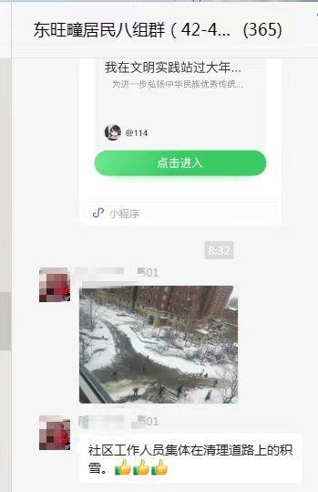 “为南门的值班大叔点赞,给我们清扫出回家的路!”“社区工作人员集体在清理道路上的积雪!”从2月4日晚上开始降雪,东旺疃社区的居民群里,点赞声就“不绝于耳”。