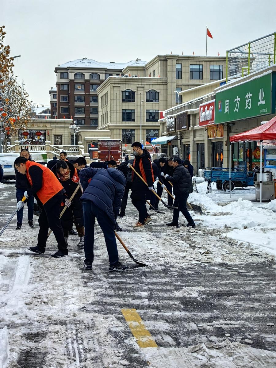 在扫雪现场,工作人员纷纷拿着铁锹、扫把、冰铲等铲雪工具,来到社区门前主干道,对居民出入交通要道、商业街面等处及时做好清扫。大家齐心协力,干劲满满,一条条积雪路段很快就被清理干净。