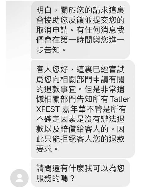 随后,读者收到Klook回应称,“客人您好,这里已经尝试为您向相关部门申请有关的退款事宜。但是非常遗憾相关部门告知所有Tatler XFEST嘉年华不管是所有不确定因素是没有办法退款以及赔偿给客人的。因此只能拒绝客人您的退款要求。”