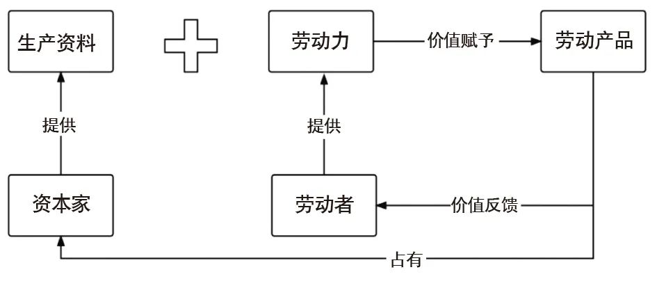 图1中,在社会劳动过程中,劳动者通过对生产资料的对象化劳动,其劳动成果所带来的价值应该完全属于劳动者所有,而在资本主义社会中,资本家掌握了劳动生产中的生产资料,劳动者在过程中提供劳动力,最终的劳动结果由劳动者和资本家共同所有,此时劳动者和资本家尚处于平衡状态,经过多轮的劳动生产累积,劳动结果的价值通过市场经济行为的转化,帮助资本家掌握更多生产资料,而劳动者在多轮劳动生产中从劳动结果中获得的价值,由于无法通过市场行为将产品价值转化为更加高效、强大的劳动力,只能在市场中消费以满足自身的基本生活需求,如果劳动力无法在生产过程中得到能力的提升,劳动异化将是必然发生的现象。