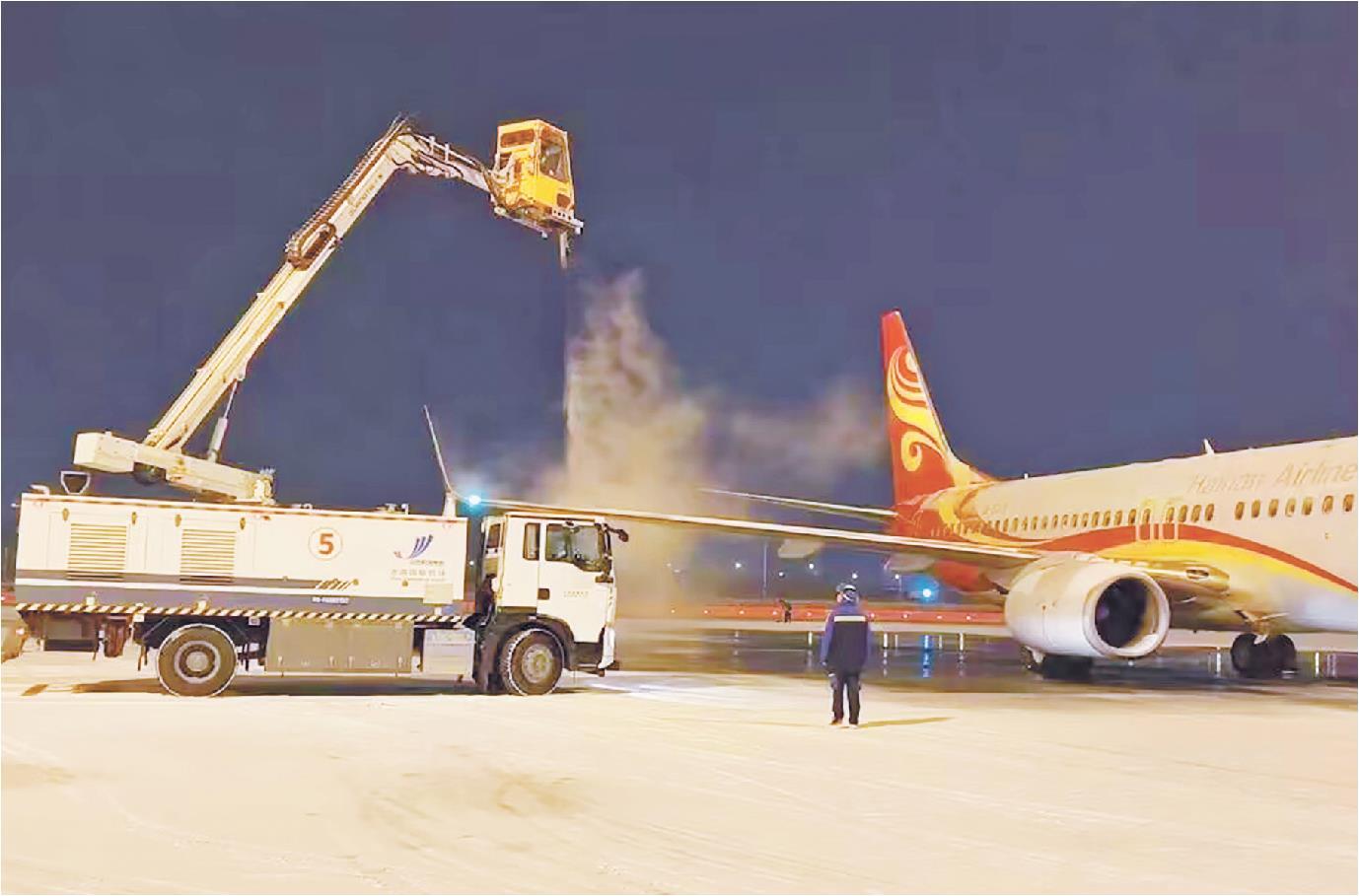 图①:2月5日凌晨,济南机场机务人员出动相关除冰雪设备对出港前飞机进行除冰雪作业。(记者 常青)