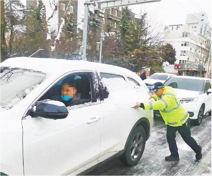 图②:2月4日,泰安市泰山区上高街道华新社区迅速组织党员、网格员、志愿者等清理积雪、疏导交通。(记者 曹儒峰 通讯员 李青)