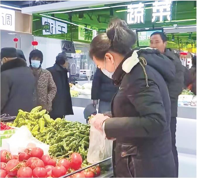 图③:2月5日,在枣庄市薛城区东山智慧农贸市场,市民正在挑选蔬菜。(记者 孟令洋)