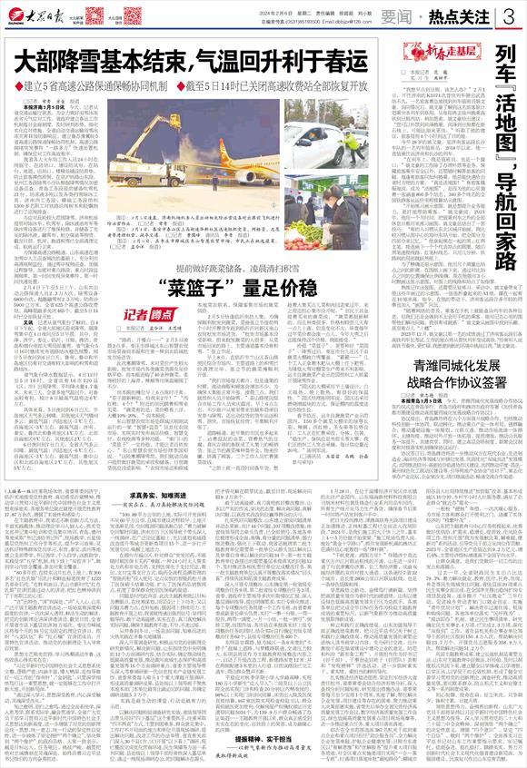 2月5日恰逢临沂南坊大集。为确保顺利批发到蔬菜,菜商张立节提前两个小时开着货车赶到临沂沂河新区皇山农贸批发市场进货。“批发市场基本没受影响,前来批发蔬菜的人很多。从菜市场回来的路上,主要通道基本没有积雪。”张立节说。