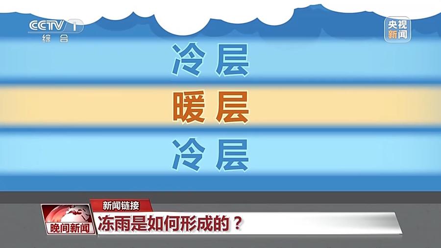 冻雨的形成需要有一个特殊的大气层结构,有点像夹心糖或者三明治,从上而下大气层的分布是冷—暖—冷的状态。