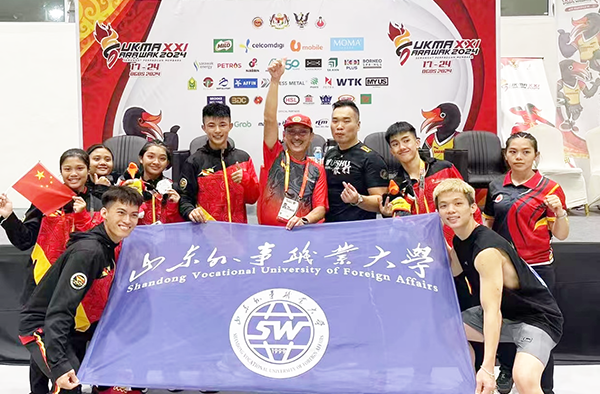 2024年第二十一届马来西亚运动会武术散打比赛于8月14日至16日在吉隆坡体育馆举行。之前,山东外事职业大学武术学院受邀派出散打教练周永杰、助教徐长修对砂拉越武术总会7名运动员进行了为期58天的培训。尽管队员们的基础相对薄弱,且训练条件及设施设备也不完善,周永杰、徐长修秉持着“尚武精神”帮助运动员们克服重重困难,在强敌如林的激烈竞争中,勇夺男子52公斤级和女子56公斤级两个项目的亚军,这一结果是砂拉越武术总会自成立以来的最佳成绩。这不仅为中华武术在海外的传播与推广起到了积极的宣传作用,同时也是山东外事职业大学“迎进来、走出去,职教出海、武术文化先行”的重要举措。
