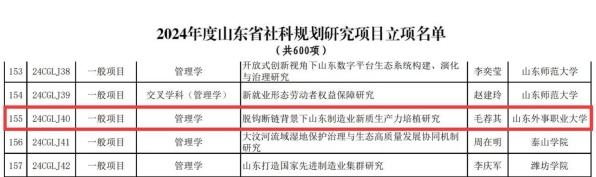 近日,山东省哲学社会科学工作办公室公布了《2024年度山东省社科规划研究项目立项名单》。山东外事职业大学国际商学院院长毛荐其教授的《脱钩断链背景下山东制造业新质生产力培植研究》获准立项。