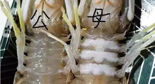 脖子上带白色“王”字的是母的,爬虾第三对足各有一只小腿的为公,母的形体较小,脖子较细。