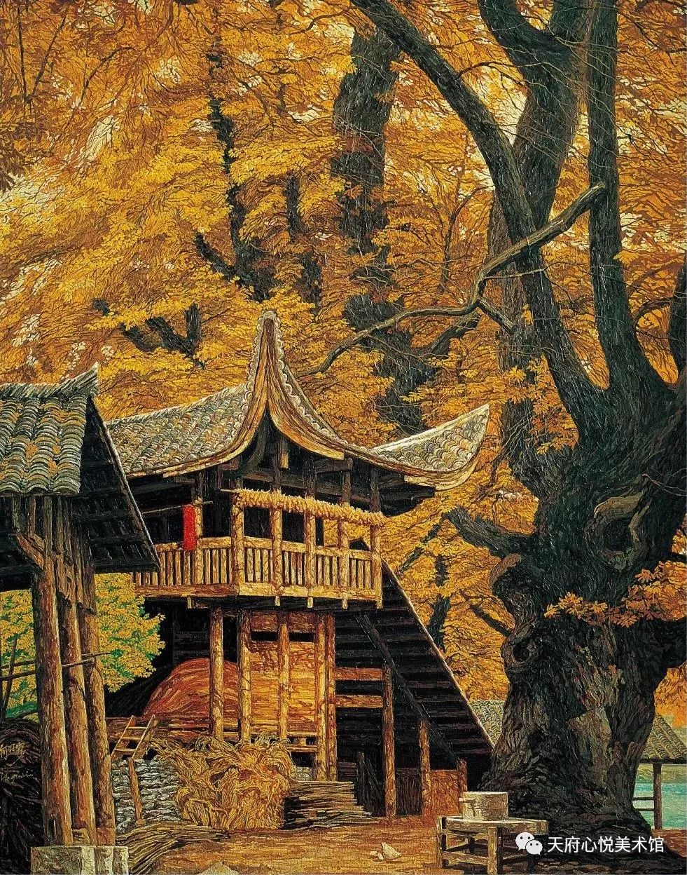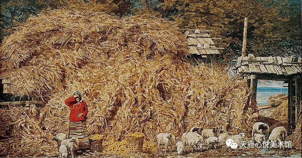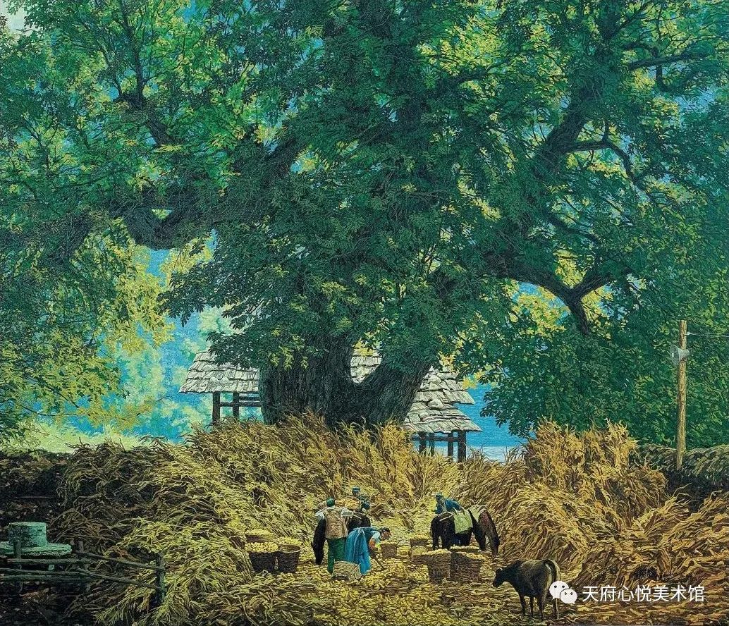 远处的山脉浸在层层的薄雾中,时隐时现;近处的山峦有溪流从山口处溢出,潇洒地奔腾倾泻,蓝天下有群鸟掠过;翘角的木瓦房壁上缀满了成串的玉米,并与四周浓密的枫树林以及高矗的温厚的麦垛携手勾连,组成令人炫目的秋日金黄……田园诗般的画面,在画家何冠霖笔下悠然生成,当我们走到这些画作面前,容不得片刻迟疑,便欣欣然,全部接纳。