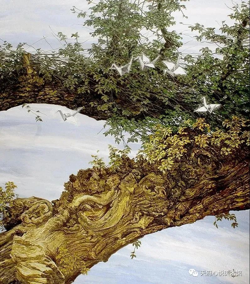 2010年上半年,何冠霖创作了几幅新的作品,取名为《纸折》系列。在这几幅作品中,我们看到两棵不同的老树,一棵根植于大地,周围是溪流,一棵是悬于天际中的躯干。之前的秋日系列作品中的房舍、牛羊和草垛等散发着浓烈生活气息的人文景观被一群向前、向上飘浮的纸飞机、纸鹤取代。作品里的自然更加纯粹,而纸飞机和纸鹤赋予了作品某种象征性。前不久,作者曾向我讲述过,他画的那些田园景致,很多已经看不到了,当今的工业化扩张也蔓延到了他曾心醉神迷过的净土,他对此感到很焦虑也很无奈。这让人想起数年前在全球放映,并引起轰动的美国大片《阿凡达》来。不知何冠霖是否受到《阿凡达》故事的影响,至少他的这几幅作品让人强烈地感觉到那极为相似的情境。