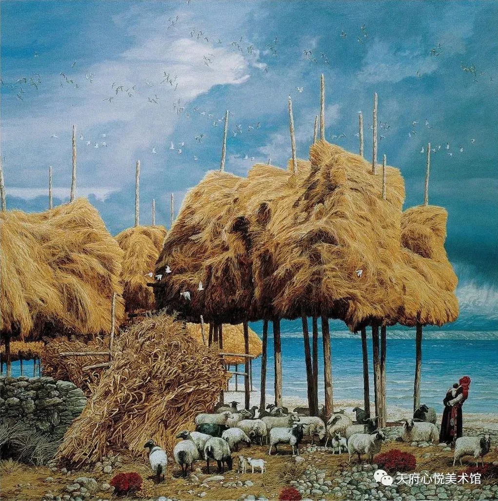 他让高山巍峨雄浑而不失纯朴和亲近;让大树沧桑遒劲而不失丰盈和多姿;他用自由翻飞的鸟儿去稀释蓝天的寂寞和深遂;用农舍、麦垛、牛羊去搅动起大地的生机和浪漫,而不仅再是苍茫和荒凉。同时,他也借用了版画的技巧和元素,用平面的线条和单纯的色块去拼接出光影的效果并抑制过多细节可能带来的某些匠气。他试图以此去勾勒出他心中的风景,是一种可从心理和生理感知并触摸的充满着柔软、灵动、宽爱、祥和的既具有浓郁的人文感性,又不失理性秩序的人间田园,并试图用这样的图式来召唤和抚慰那些被困于林立的高楼中、迷失在眩晕的霓虹灯下、沉溺于功利、被“锁”于冷寞的人际幕墙内的欲求解脱的“现代难民”。