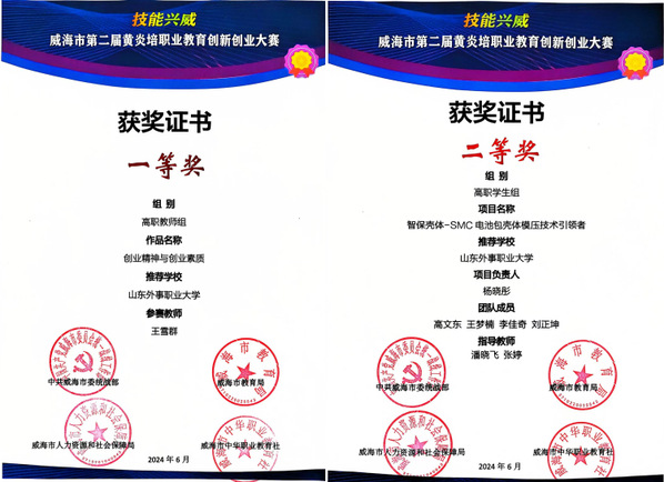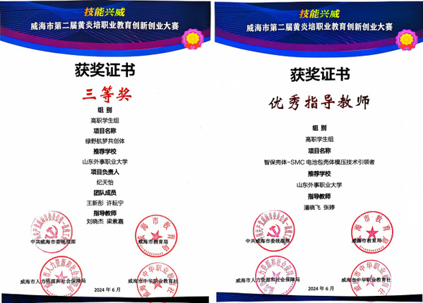近日,由中共威海市委统战部、威海市教育局、威海市人力资源和社会保障局及威海市中华职业教育社联合主办的“技能兴威”威海市第二届黄炎培职业教育创新创业大赛圆满落幕。山东外事职业大学在此次大赛中荣获教师组一等奖1项,学生组二等奖1项、三等奖1项,优秀指导教师奖1项。