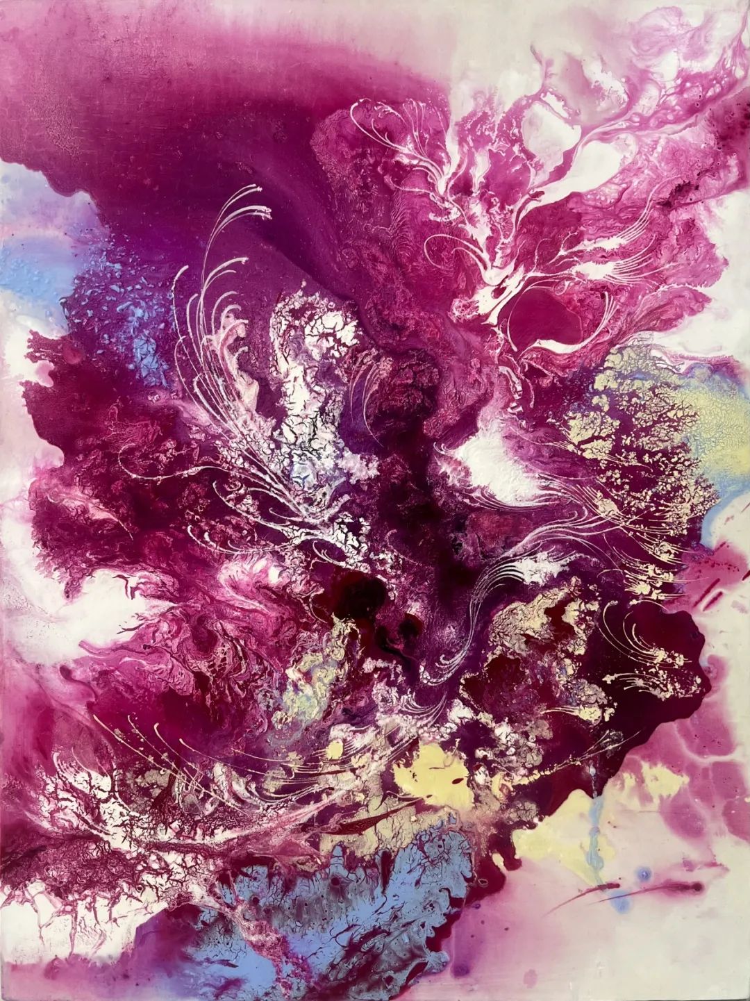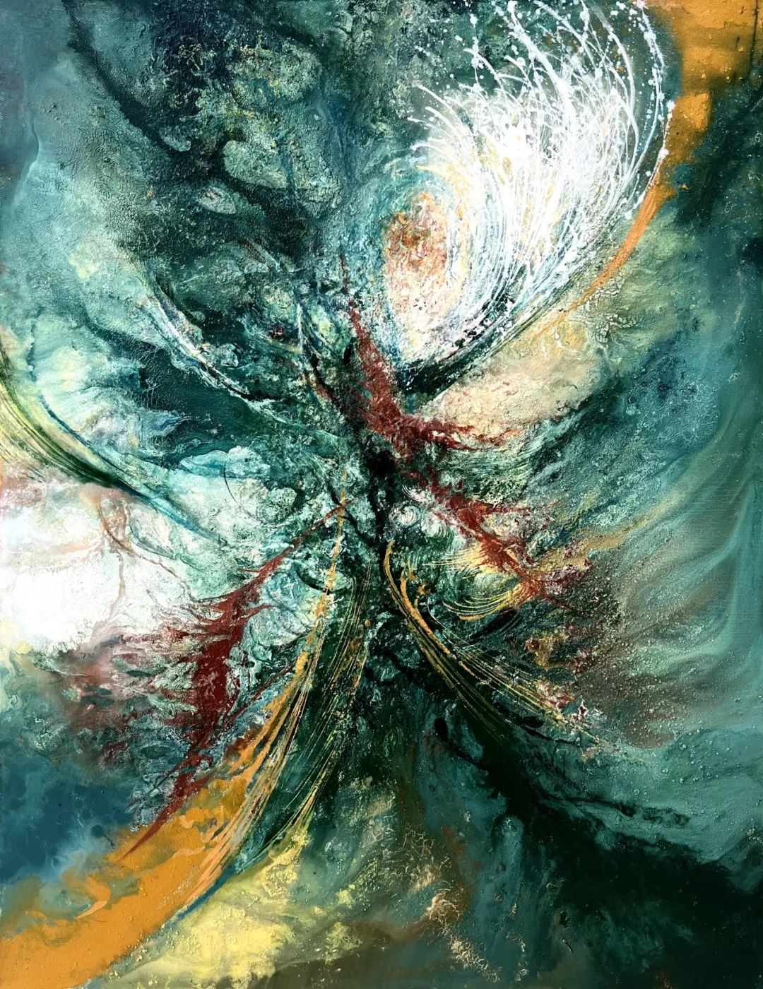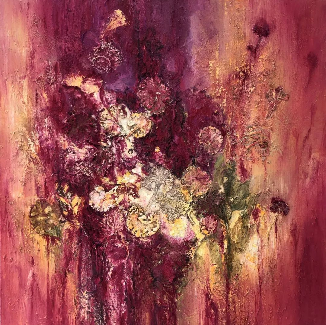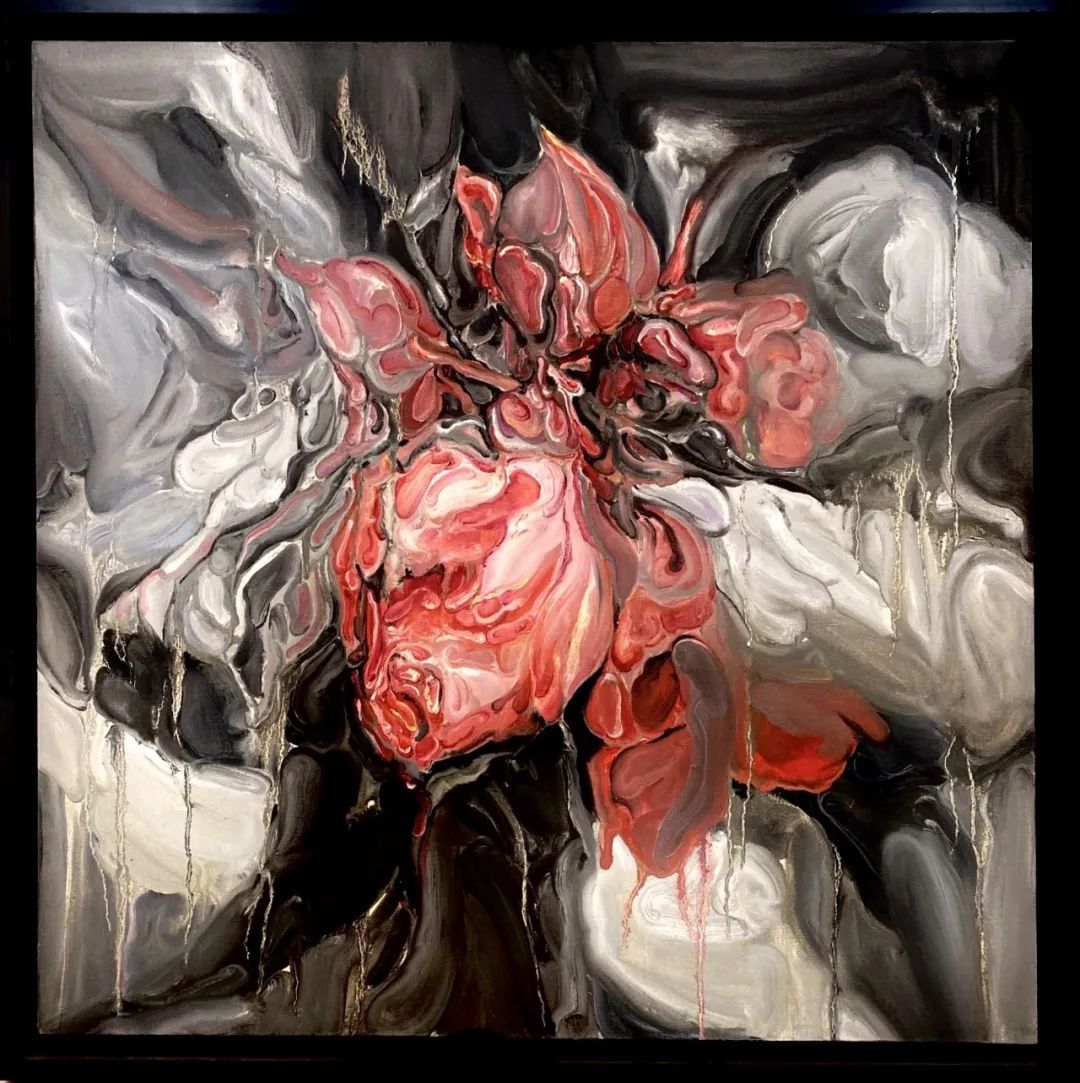 几年前刘垚宏开始接触《道德经》、《金刚经》,并且一直坚持瑜伽、冥想,这也促使她对于生命主题的创作表达发生了变化,在形式上是一次解构再重构的过程,由原来的表现主义演变为抽象表现主义。在内容上则融入了批判意识,她指出了人性中的弊病,譬如麻木、贪婪,太过追求物欲,缺乏内观和觉知自我内心的精神,以及对生命的敬畏与思考。正是从这一时期,刘垚宏作品中花的形态逐渐模糊,结构更加自由奔放,她所崇尚的“虚极静笃”也由此而生,因此我将这一时期称之为艺术家的“泛花时期”。此时的花似花非花,已经超脱于花的形态与本意,更加凸显出艺术家追求生命本真的初心。