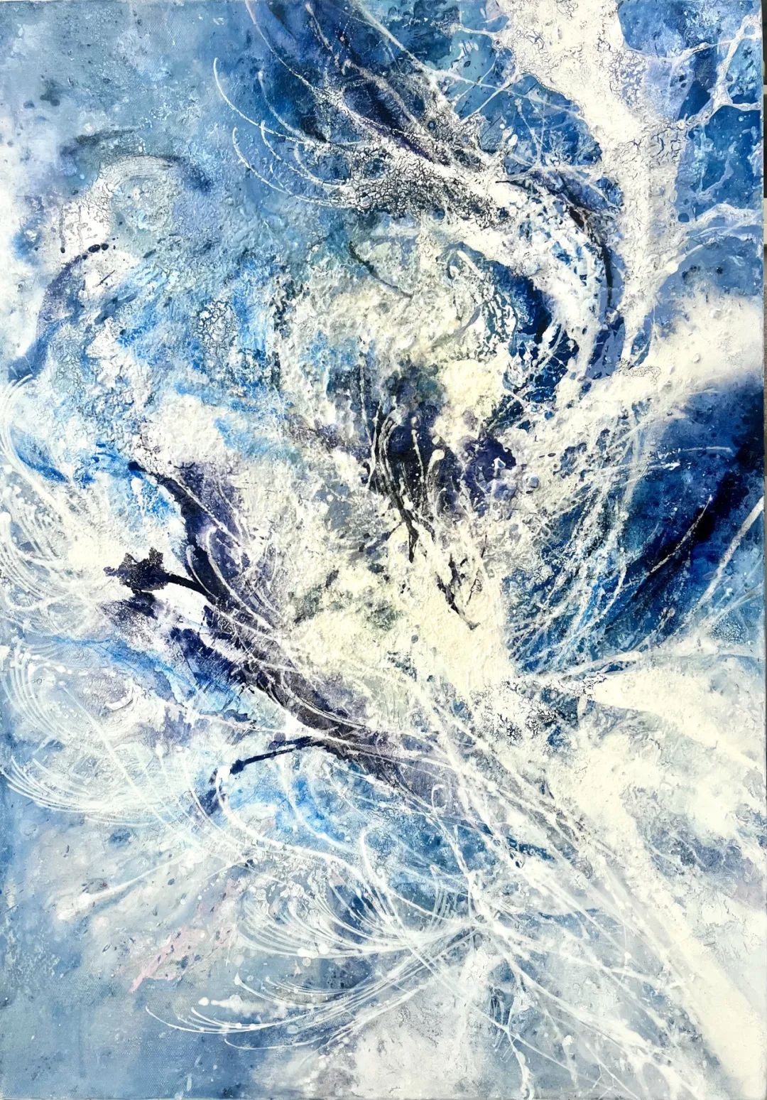 刘垚宏的艺术创作逐渐走向抽象表达,归根结底是对宇宙生命本质的理解与思考。中国艺术研究院博士生导师王端廷认为,抽象艺术是工业文明时代人类基于人本主义世界观和理性主义思维方式,用符号数学、物理学和心理学原理的视觉语言,揭示宇宙和生命内在本质的艺术。天津美术学院教授范晓楠认为,抽象语言的“冷”和”热“是艺术家个体内在阴阳能量场的制衡与外化。当然,这也体现了艺术家感性表达与理性哲思的内在抗争与交融。刘垚宏的作品通过色彩在画面上的碰撞融合裂变,以及虚虚实实具有生命节奏张力的线条来表达内在的情绪,她的即兴创作通过对潜意识的探索来进行情感的抒发,这也是我们通常所谈到的“热抽象”。
