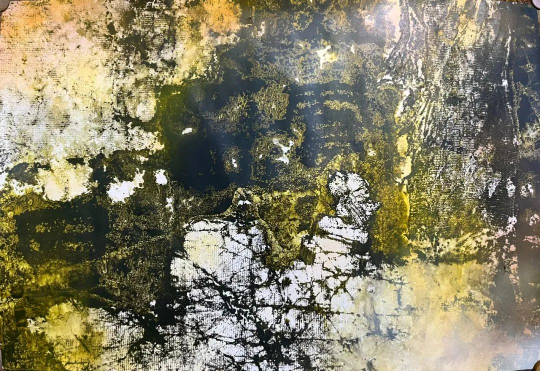 郑忠的综合绘画融合了水墨的灵动与版画的质感,创造出一种独特的视觉语言。他的作品中,线条与墨块交织,层次丰富而又充满韵律。在画面上,常常能看到似是而非的形象,仿佛是从混沌中孕育而生的生命形态,又像是宇宙深处的神秘景象。这种独特的艺术表现形式,打破了传统绘画的具象束缚,却又并非完全走向抽象的虚无,而是在两者之间构建了一个充满诗意与遐想的空间。