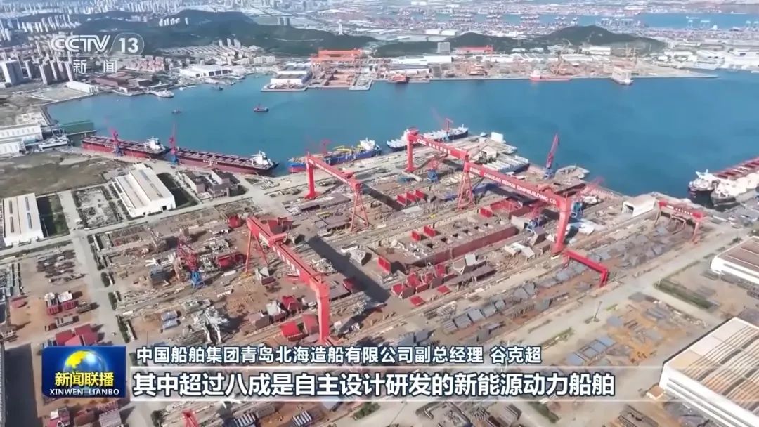 中国船舶集团青岛北海造船有限公司副总经理 谷克超:我们签下的订单有71艘,工期已经排到2028年底,其中超过八成是自主设计研发的新能源动力船舶。