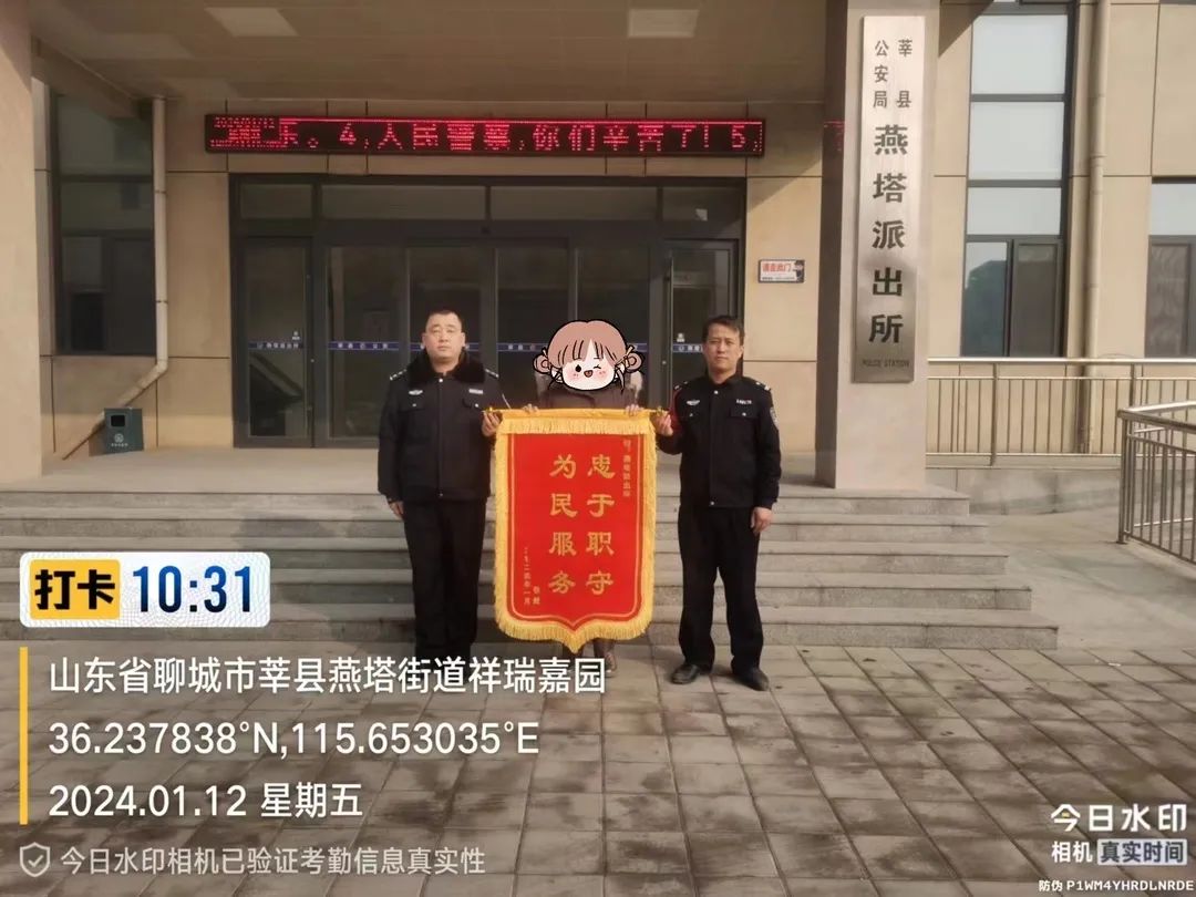 2024年1月12日10时,白女士将一面印有“忠于职守 为民服务”的锦旗送到聊城市莘县公安局燕塔派出所民辅警手中,对他们心系群众、认真负责的工作态度表示衷心的感谢。