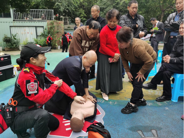 紧接着,活动转入急救知识培训环节。携手急救专家张教官首先向大家介绍了基本的急救原则和步骤,并强调了“时间就是生命”的重要性。通过现场演示和互动教学,他传授了心肺复苏、止血包扎、烫伤处理、伤员搬运等急救技能。参与者积极上前体验,张教官耐心地纠正他们的操作细节,确保每位参与者都能掌握正确的急救方法。在心肺复苏教学中,张教官详细讲解了判断意识、启动紧急反应系统、检查及畅通呼吸、胸外按压和人工呼吸等步骤,并强调了“黄金四分钟”的重要性,即心脏骤停后的最初四分钟是实施心肺复苏的最佳时间。参与者在模拟人身上进行实操练习,逐步掌握了这项重要的急救技能。