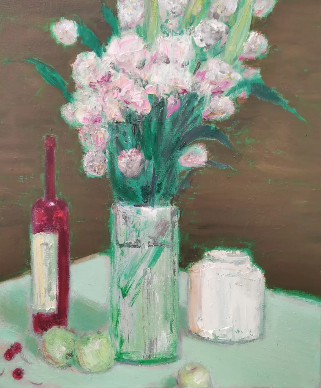 岳海涛教授的静物画,首先令人印象深刻的是其对细节的极致追求。在他的笔下每一朵花、每一片叶都被赋予了生命,它们或含苞待放,或绚烂绽放,每一个姿态都透露出自然界的微妙变化与生生不息的力量。他善于捕捉那些稍纵即逝的瞬间,将之定格在画布上,使得观者仿佛能听见花瓣轻轻触碰的声音,感受到露珠从叶尖滑落的凉意。这种对细节的精准把握,不仅展现了岳教授高超的绘画技巧,更体现了他对自然之美的深刻感悟与敬畏之心。