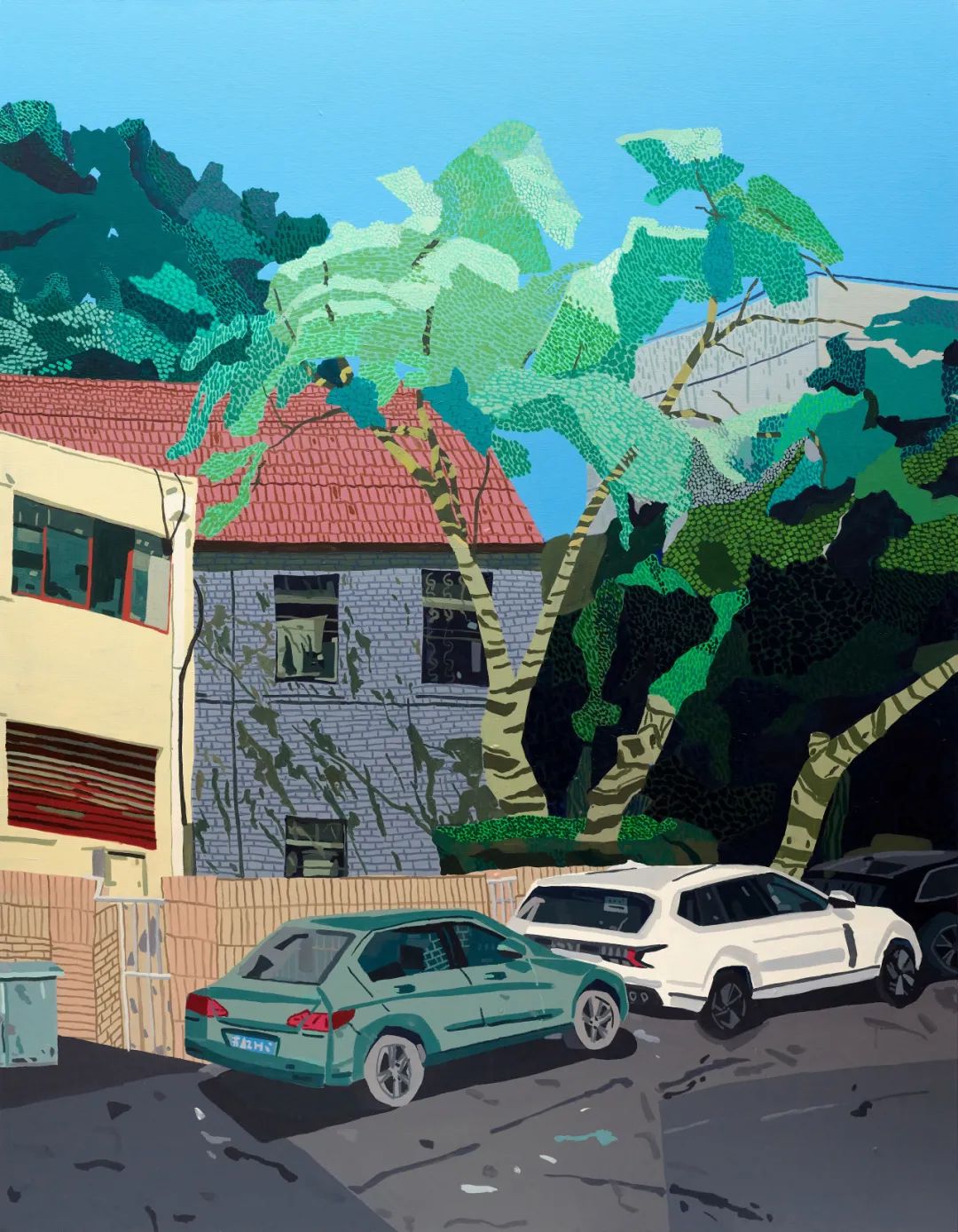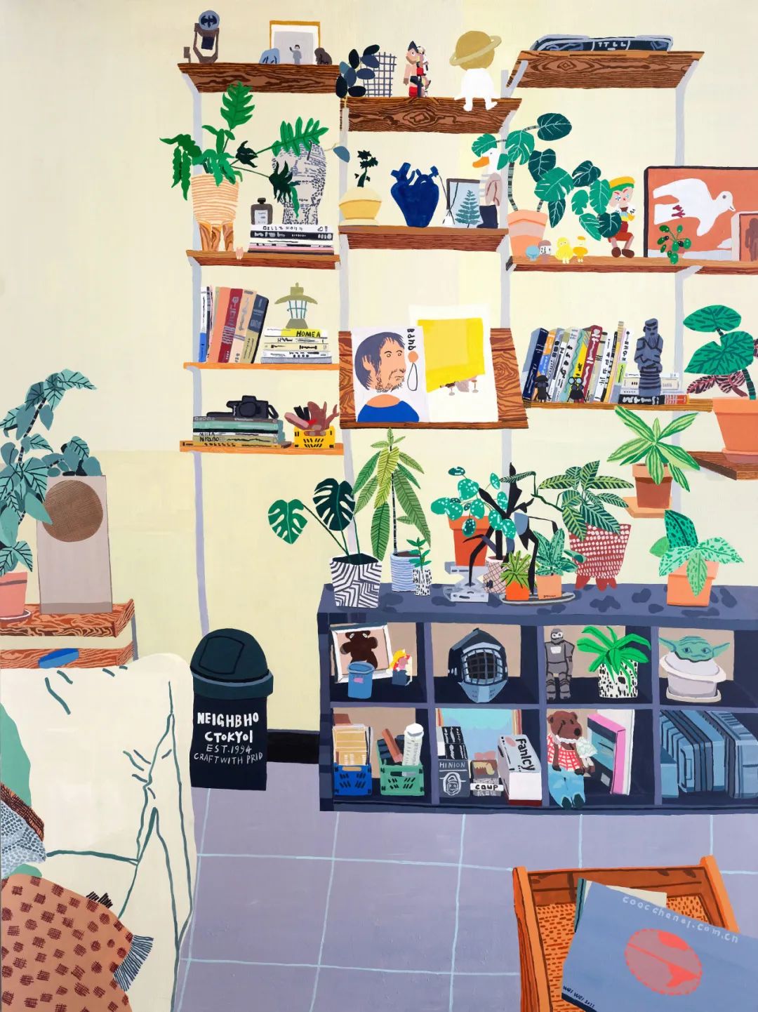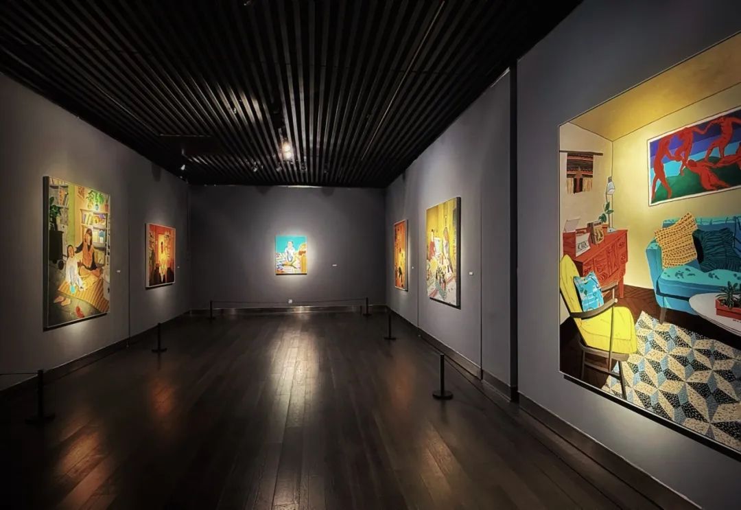 魏巍的绘画题材大多源于家庭亲密关系的瞬间呈现,对日常物品和家庭场景的独特描绘,普遍采用了超饱和的色调,并在细节上达到了一种几何式的精准,让人感觉大气沉静的同时,传递出一种日常幸福触手可及的氛围。如在《室内景观系列》,我们能深切地感受到画家对中产生活的知足。就好像在一个阳光明媚的日子,你我作为客人,画家领着你参观他的家,走进客厅、书房或画室,介绍女主人,和一儿一女;再邀请你入座,喝喝茶,品尝桌上JJJ车厘子,透过窗户看他的居住环境,外面风和日丽,顺便再向你传授一些室内龟背竹的摆放与鉴赏心得。主人兴致盎然地描述他的生活,我们也被画家的情绪所感染,欣欣然。
