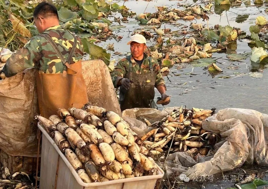 秋末冬初的东营区,藕已悄然成熟。在牛庄镇大杜村的藕池,挖藕人半蹲着,娴熟地在泥地里刨“金”。