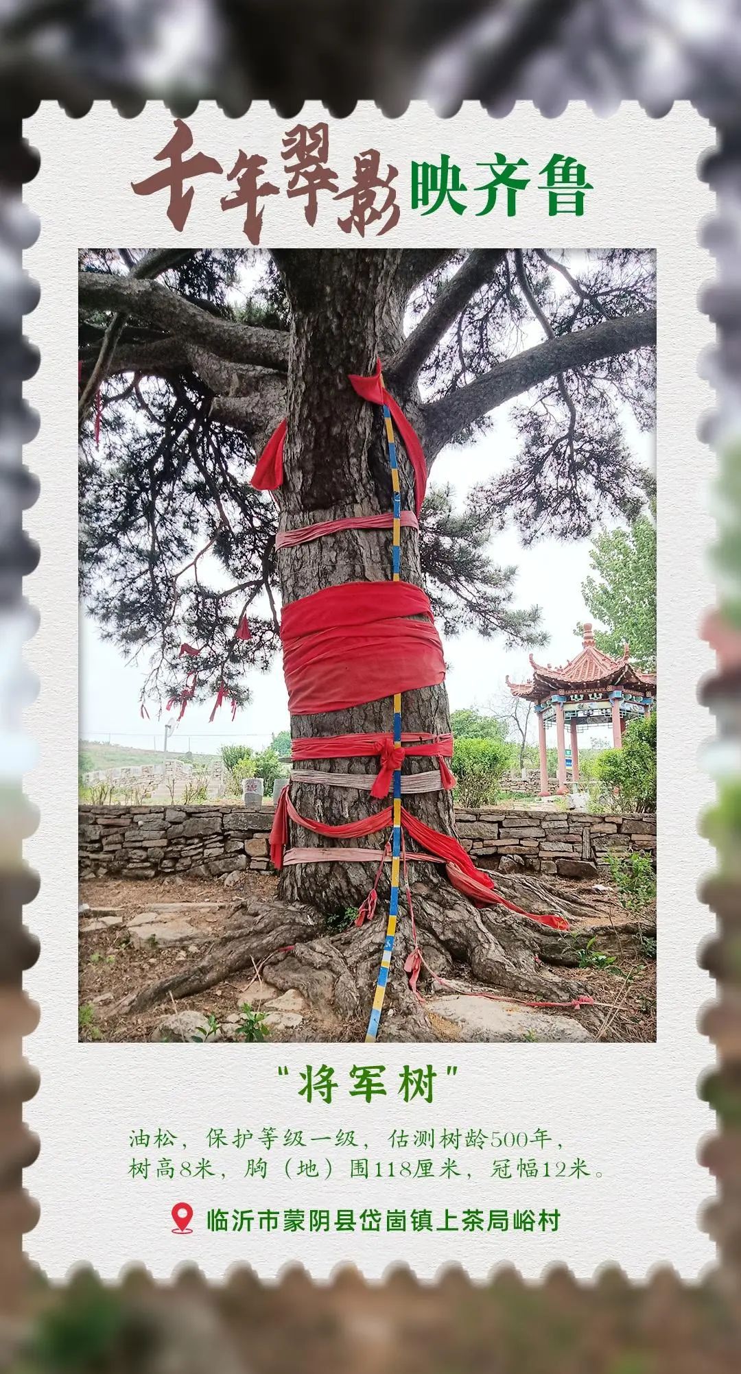 在山东省临沂市蒙阴县岱崮镇上茶局峪村的一处名为磨盘岭的地方,有一株见证了500多年风雨沧桑的古树——油松,它被当地村民亲切地称为“将军树”。