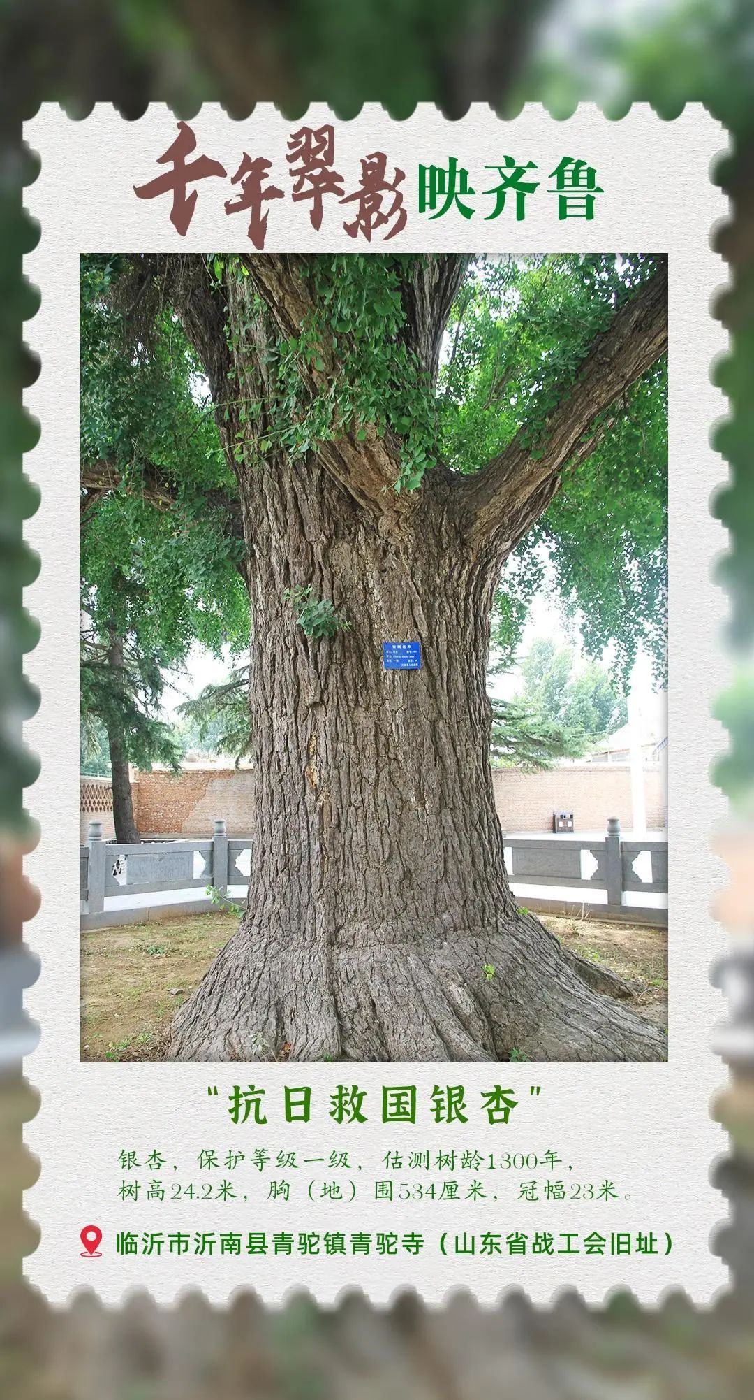 位于山东省临沂市沂南县青驼镇青驼寺,有一棵被誉为“抗日救国银杏”的古树,这棵树不仅以其1300年的沧桑岁月见证了中华大地的变迁,更是作为山东省抗日民主政权创建的重要历史见证者而载入史册。
