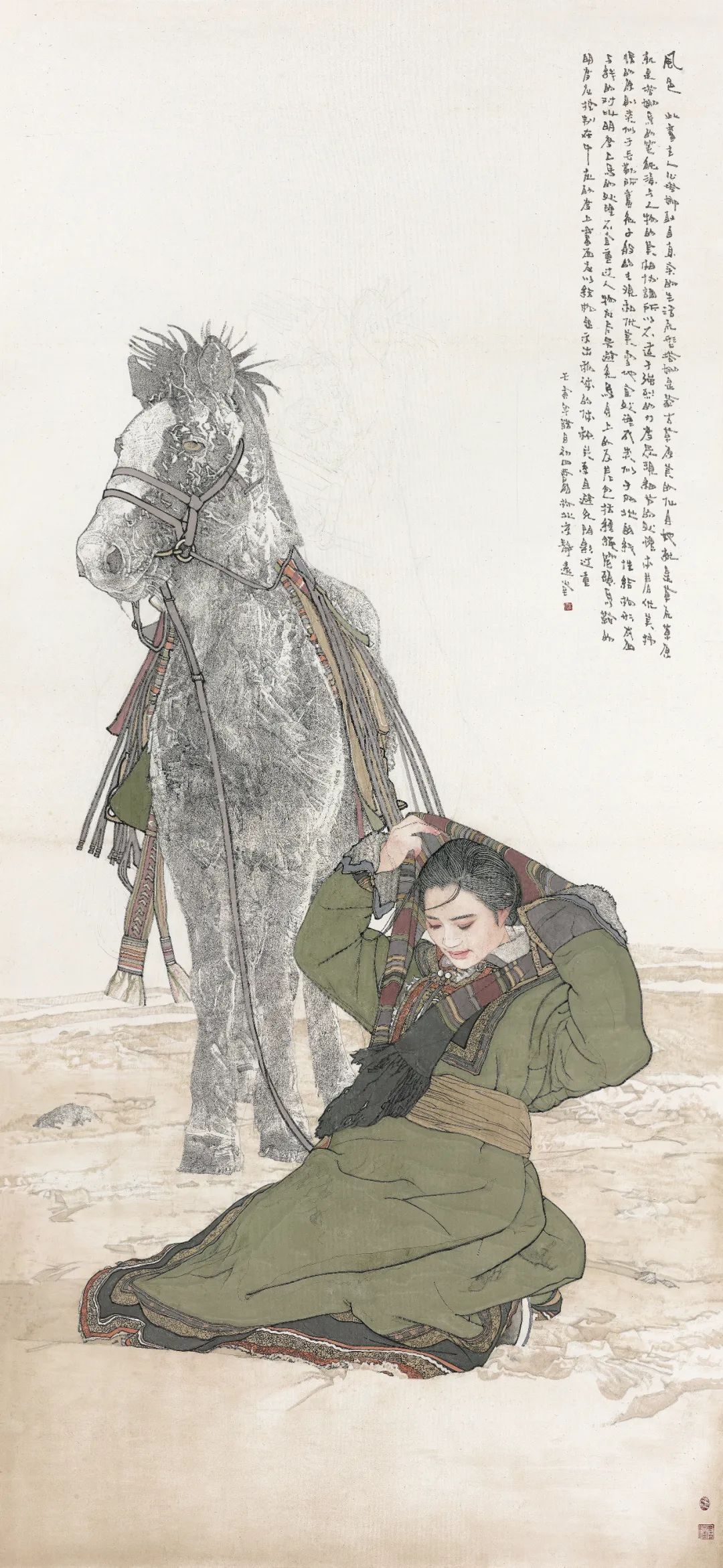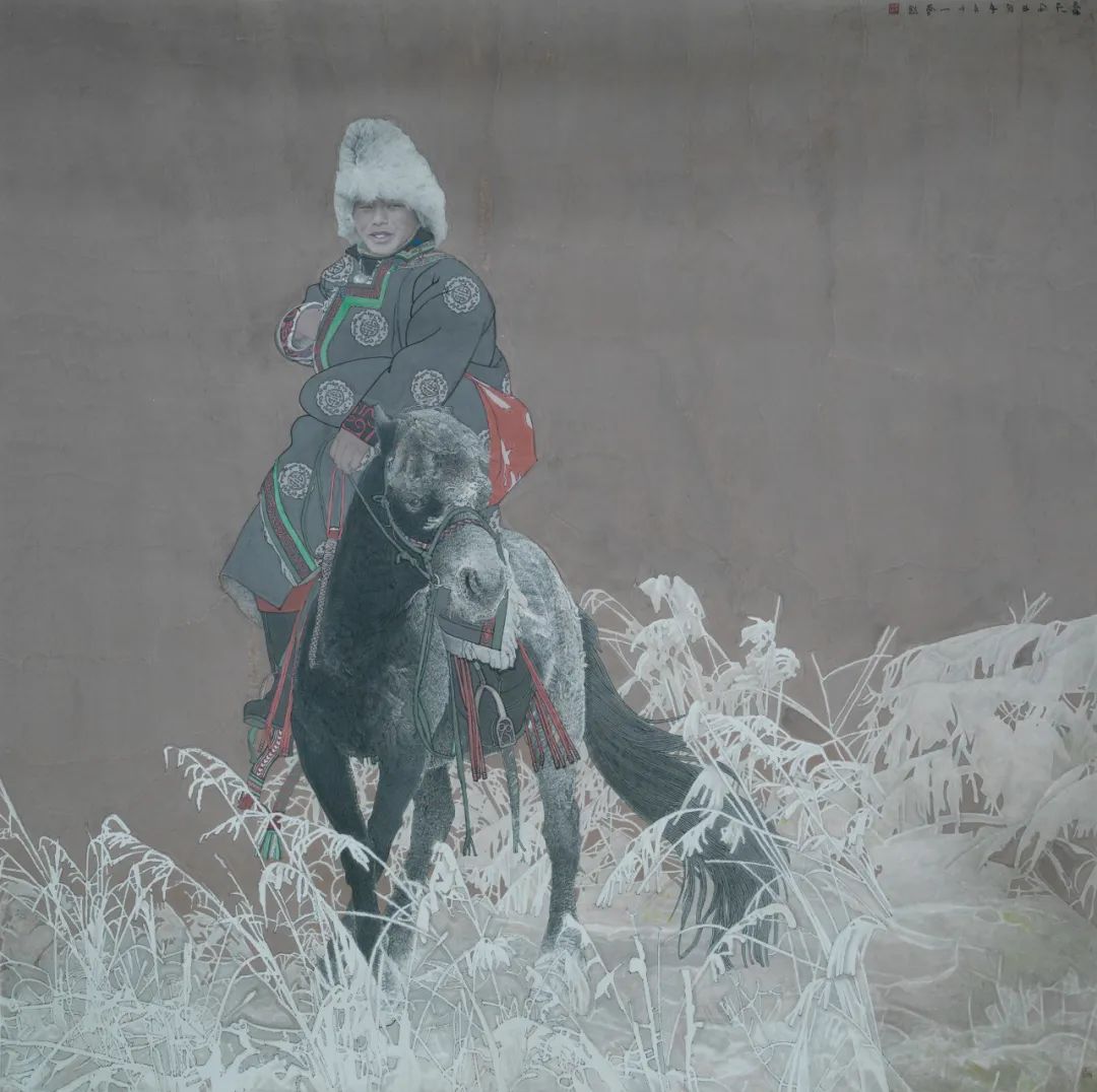 通常,人们买宣纸存放绝大多数选择的是特净皮与净皮两种。我在表现蒙古霜雪题材主要使用的是文魁宣(图2)。虽其尺寸是200cm×200cm,但质地上绝对不超过六尺净皮的厚度。系列三的连绵扎花质地较薄,尤其以扎花为最薄,它对于制作原料及加工工艺尤为苛刻。我的四尺小写意人物多是选用扎花。
