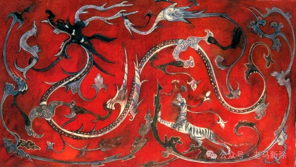 其中,青色巨龙尤为引人注目,龙身长约7.5米,占据了大半个壁画,背生双翼,足踏云气和灵芝,图中巨龙尤为醒目突出,身呈“S”形弯曲,占据整幅画面的中央,龙身长约7.5米,龙舌卷住一怪兽的尾部,龙身覆满鳞纹,背生有双翼,足踏云气、长枝花朵等,张口吐舌,飞行在天,体态矫健,威武又灵动。