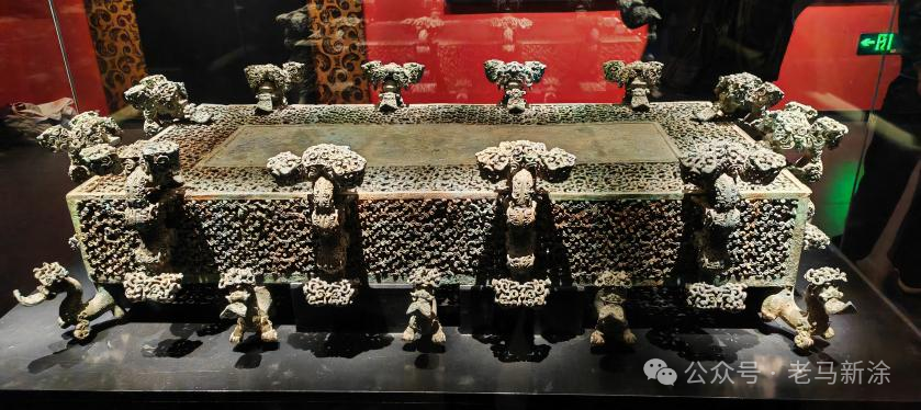 云纹铜禁出土于春秋中期的子庚墓,云纹铜禁的出土说明当时楚国国力之雄厚,也说明楚国一统天下的决心。其艺术价值在于雕刻精美的花纹,以及龙和虎的雕刻,上方由十二条龙衔接而成,下方有十二个虎构成,大家仔细观察会发现虎的舌头是伸出来的,仿佛在垂涎上面的美酒,也有人说是表现云纹铜禁之重,压的十二个虎突出了舌头,再仔细观察,你会发现上面的雕刻的镂空花纹不是一层,而是有好几层,其工艺手法堪称精美。