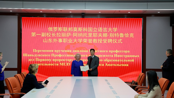 在座谈会上,山东外事职业大学聘任拉丽萨·阿纳托里耶夫娜·别特鲁恰克为荣誉教授,副校长王传生为其颁发了聘书。