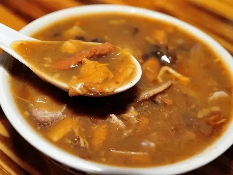 北舞渡胡辣汤,又名“八珍汤”,足以说明其内容丰富,除了胡椒、面筋之外,还有牛(羊)肉、黄豆、花生米、木耳、葱花等等。汤汁浓稠,辣度适中,越品越香,越喝越热,口中不辣,身子却被辣出汗。