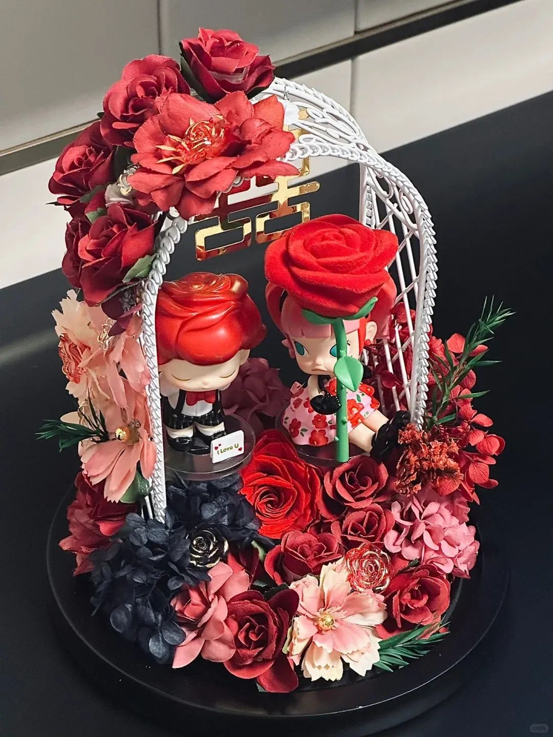 图:一位网友用泡泡玛特摆件制成的新婚礼物,图源小红书用户@阿毛毛毛