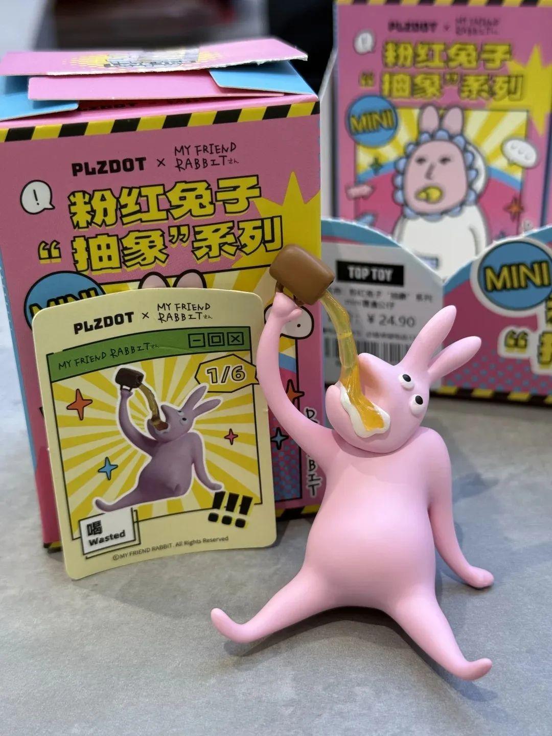 前些天,海外通讯软件line上的表情包IP“粉红兔子”的周边——抽象系列盲盒频繁出现在社交平台上,原因在于,里面手办的造型的确抽象,带来了喜感。