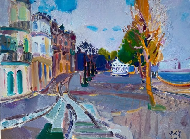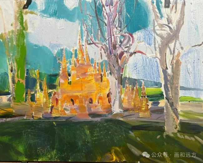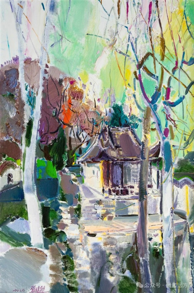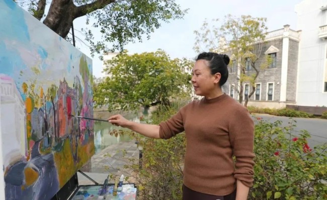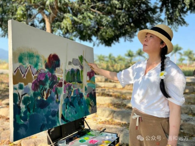 在江门市,她以细腻的情感、高超的技艺和丰富的色彩,绘出具有国际范、岭南味、侨乡韵的江门画卷;在武威市,她用手中的画笔与山水“对话”,将所见所感融入作品;在无锡市,她走进景徽堂、走上小红桥,感受深厚的历史积淀和文化底蕴;她还走进西双版纳傣族自治州写生创作,画中洋溢的热带风情,让人仿佛身临其境……