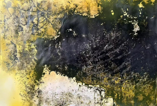 郑忠:感谢兄台百忙之中的点评,今年有这个机缘“切入”到“综合绘画”,正如当年在工厂的环境中无师自通“丝网版画”,又恰如在深圳观澜版画村的“百年孤独中”歪打正着玩起“当代水墨画”,用兄台的话“又进了一大步……”如古人诗意“好雨知时节”,所不同的是,做版画之初我还不懂我版画的好丑,只是觉得“有意思!”说不出什么所以然来,盖见识肤浅,没见过世面耳。十八年后偶然做水墨画时我已经有版画的成功经验,尽管对“水墨画”知之甚少,但对视觉效果我还是有判断力,此时需要的是对“中国画”“水墨画”知识、能力、现状的学习与“恶补”,于是从2014开始第二次北漂,就是冲着水墨画来的,是我艺术人生的转型期。深耕“水墨画”,将《海韵系列》做到了一个学术高度,现在的我身在陋室,“闭门即是深山”却胸怀天下,自己走的每一步都有审慎的认识与执行力,感性的画着,理性的“疯狂”。