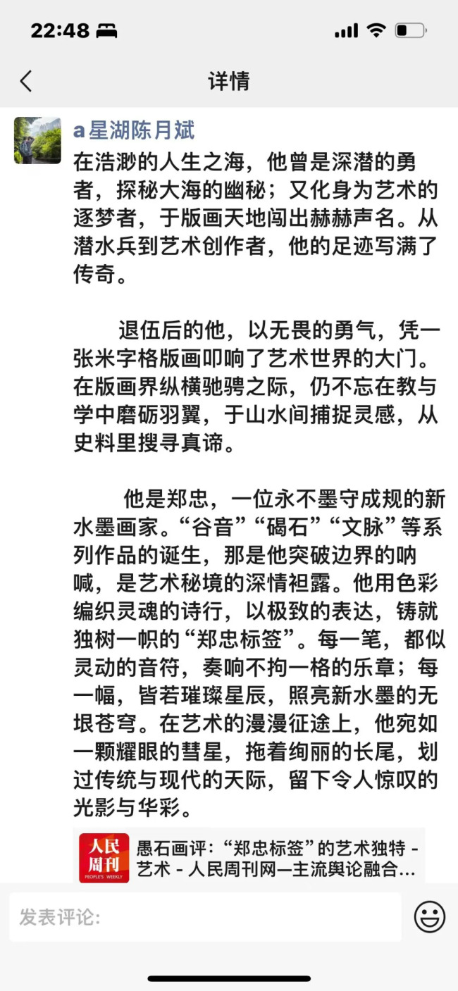 郑忠:世有伯乐然后有千里马!做潜水员我是那个时代的佼佼者(至今还是我的潜水纪录,三十多米的海底,持续八个半小时),我有超人的耐力,我会将情绪的燃点保持很久,这是同龄的画家很难有做到的,兄台是大方之家,能入您的法眼是我的荣幸!感恩兄台!