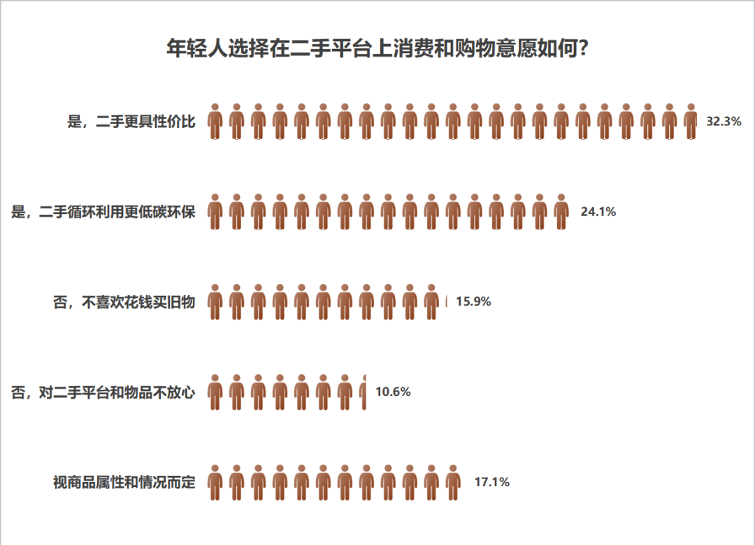 这种趋势不仅体现在品牌的倾向性,还反映在消费决策上。调查显示,超过半数受访者表示会在二手平台消费,其中,32.28%认为二手平台更具性价比,24.11%认为二手循环利用更环保低碳,还有17.13%受访者会根据商品属性和情况而定。