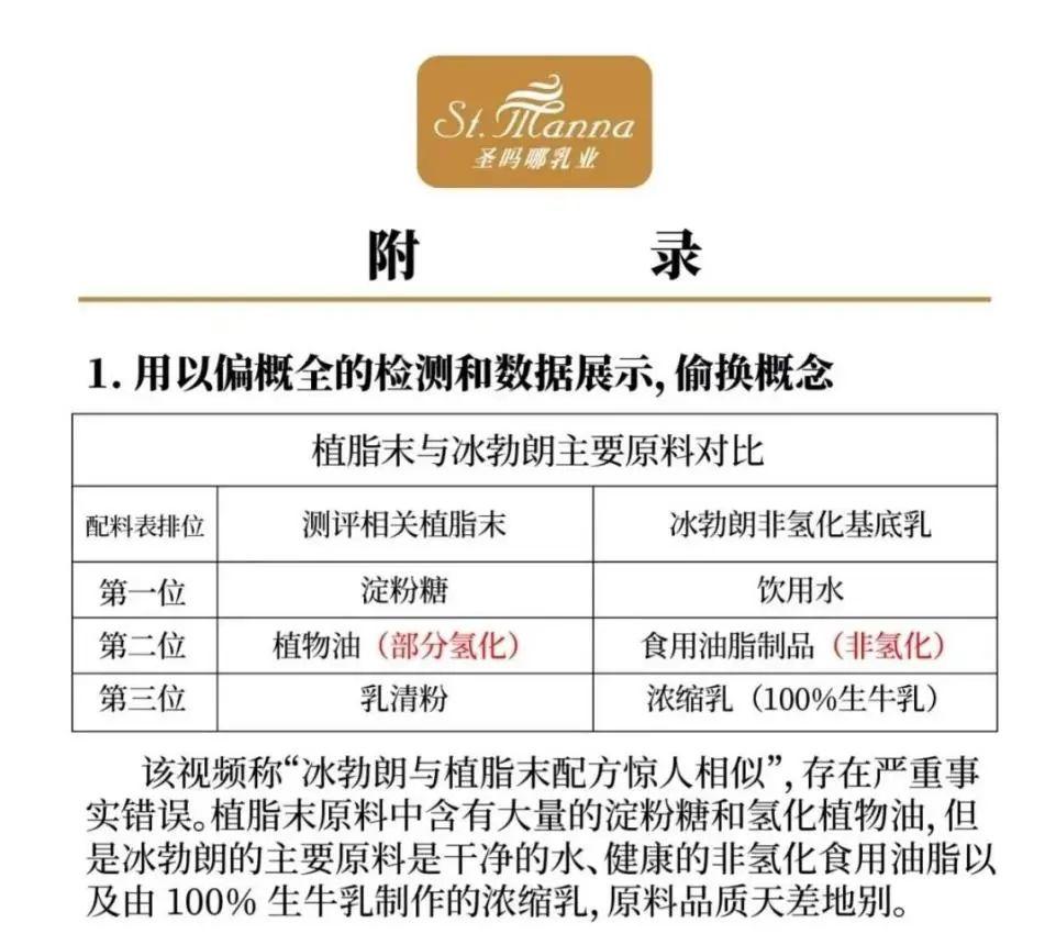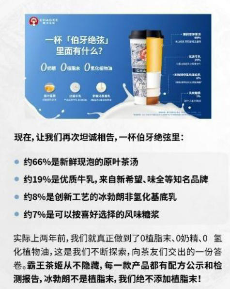 在回应中霸王茶姬澄清成分差异,明确指出冰勃朗不是植脂末,且其产品中绝不添加植脂末。强调健康创新,认为冰勃朗是更健康的产品创新,“科技与狠活”是误读。进一步解释其奶茶中的奶含量主要来源于占奶茶含量约19%的优质牛乳,而非靠冰勃朗中的牛乳含量