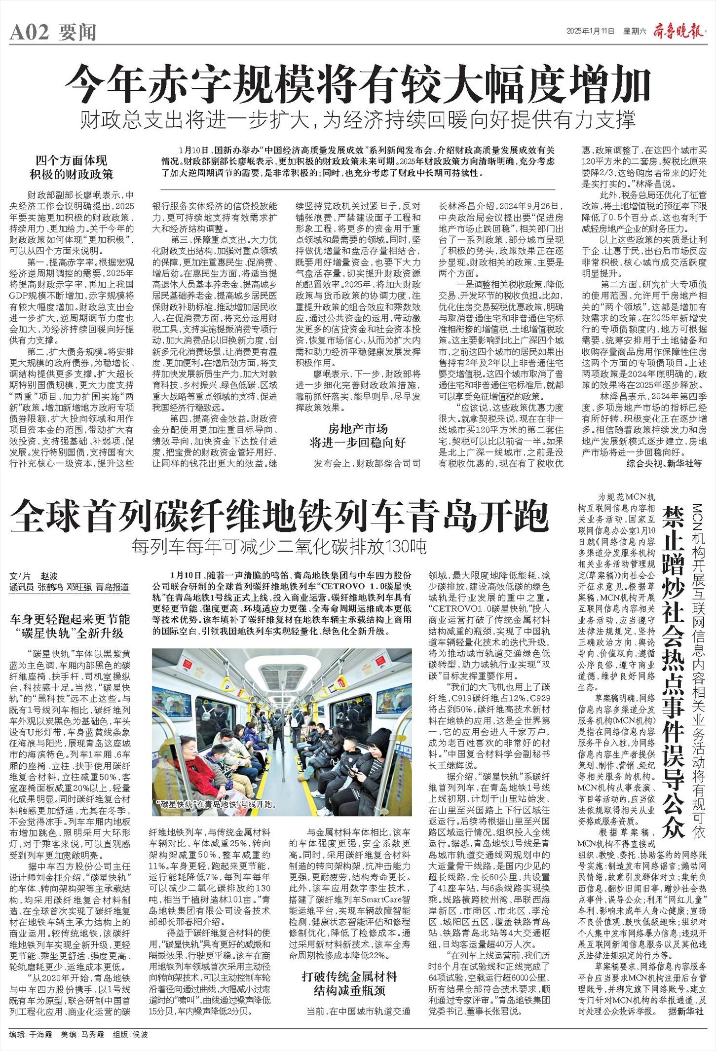 “从2020年开始,青岛地铁与中车四方股份携手,以1号线既有车为原型,联合研制中国首列工程化应用、商业化运营的碳纤维地铁列车,与传统金属材料车辆对比,车体减重25%,转向架构架减重50%,整车减重约11%。车身更轻,跑起来更节能,运行能耗降低7%,每列车每年可以减少二氧化碳排放约130吨,相当于植树造林101亩。”青岛地铁集团有限公司设备技术部部长邢春阳介绍。