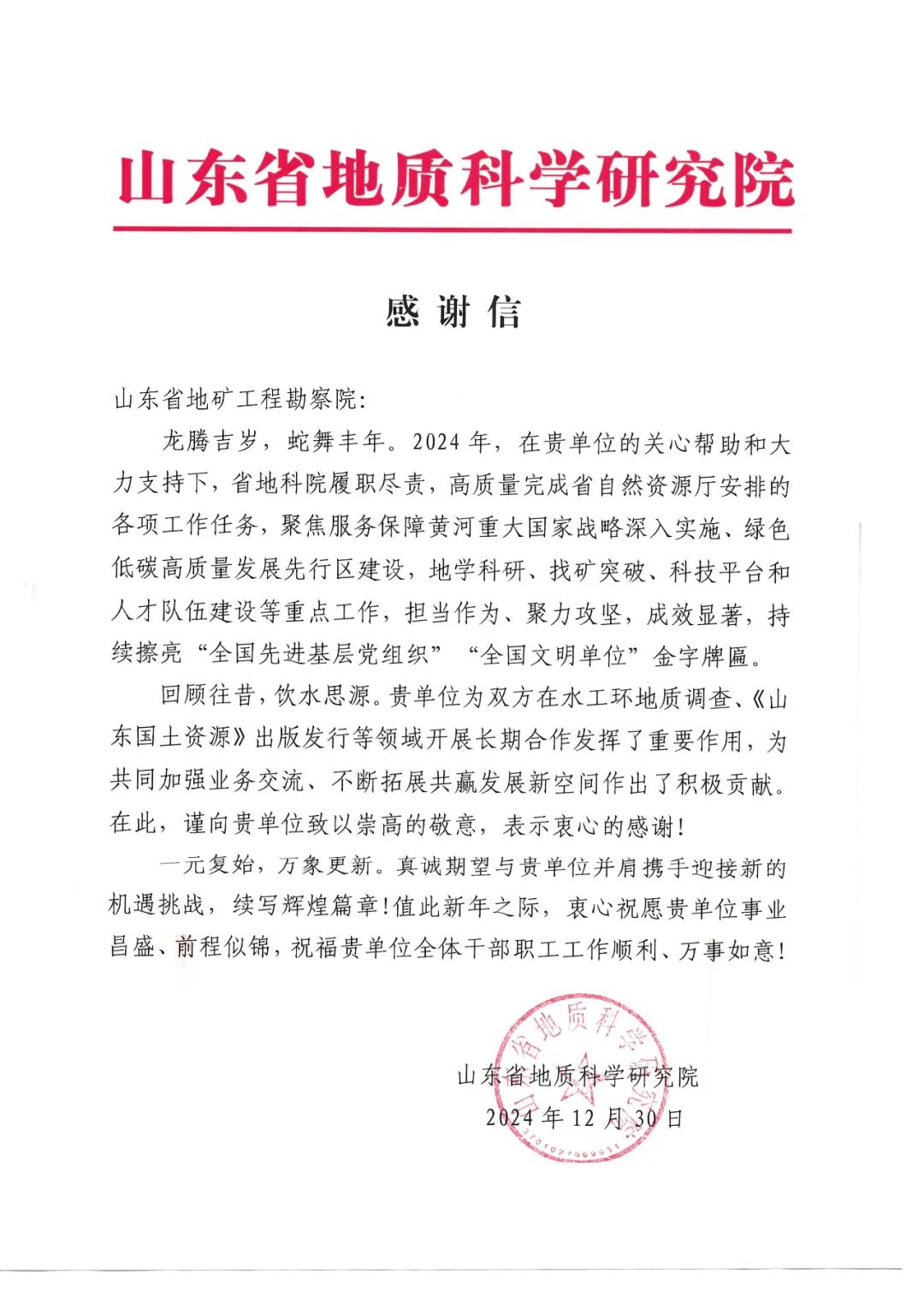 近日,山东省地矿工程勘察院收到山东省地质科学研究院发来的感谢信,对我院在水工环地质调查、《山东国土资源》出版发行等工作中提供的技术支持表示衷心感谢!