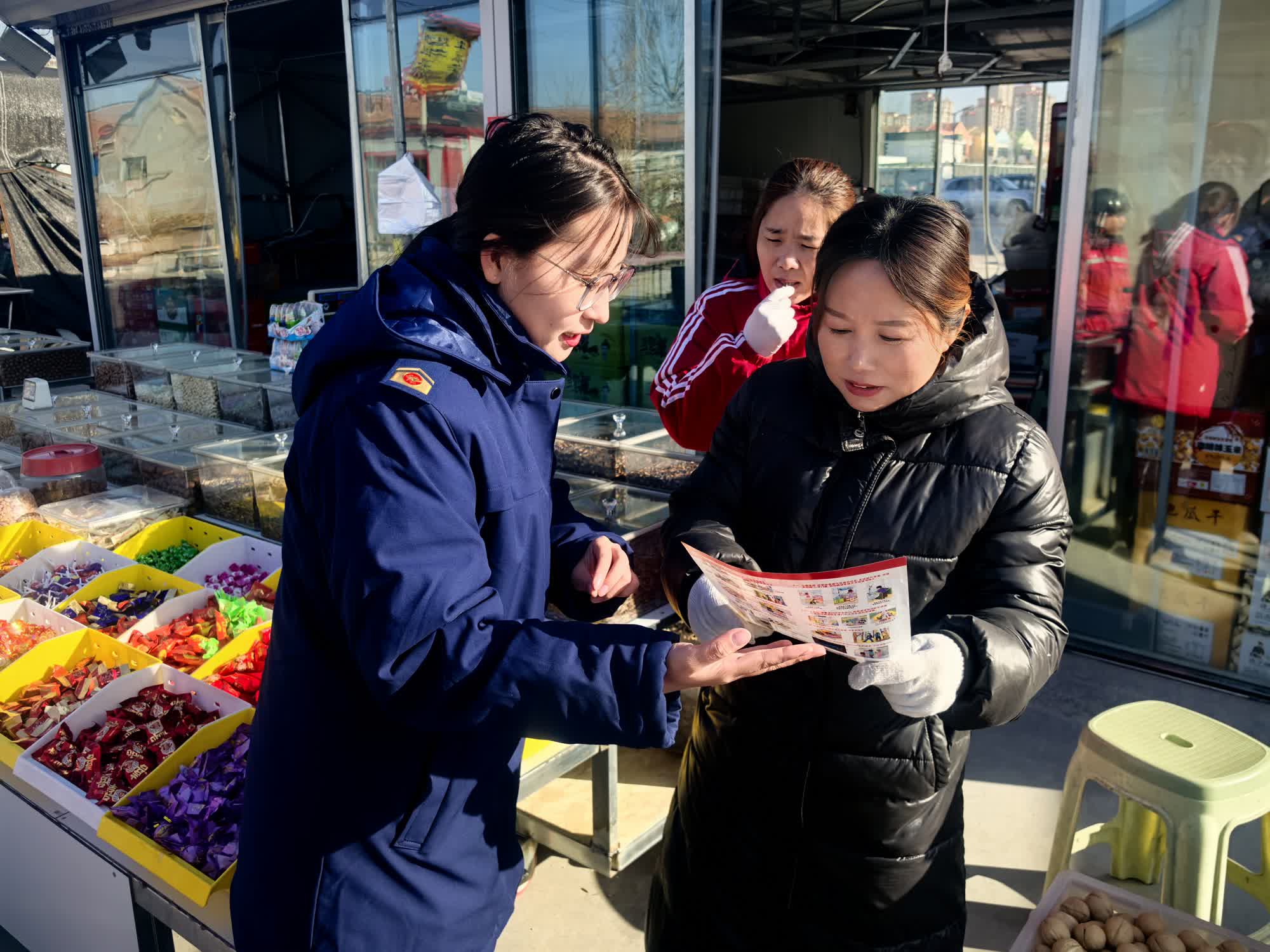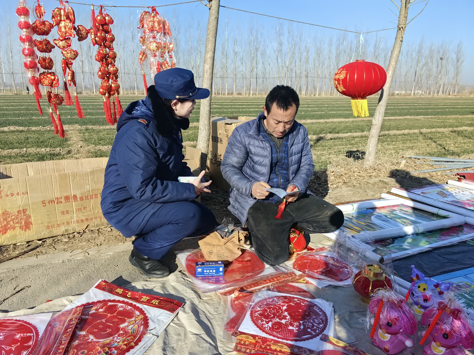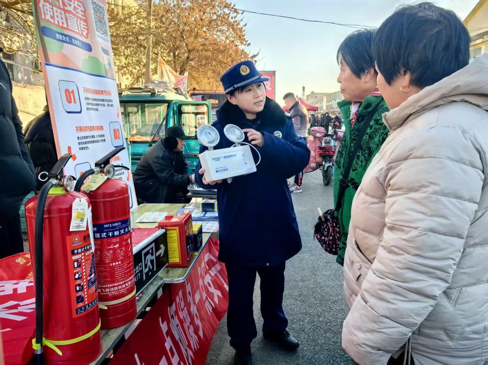 在人头攒动的天衢新区艾家坊大集上,宣传员摆好 “消防安全摊位”,向往来村民、附近摊主详细介绍消防产品用途以及假冒伪劣消防产品的危害,讲解辨别灭火器真伪方法。在通明宫大集,宣传员开设消防课堂,讲家庭防火常识、发放消防宣传资料,为大家送上新年消防安全“大礼包”。