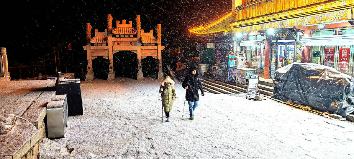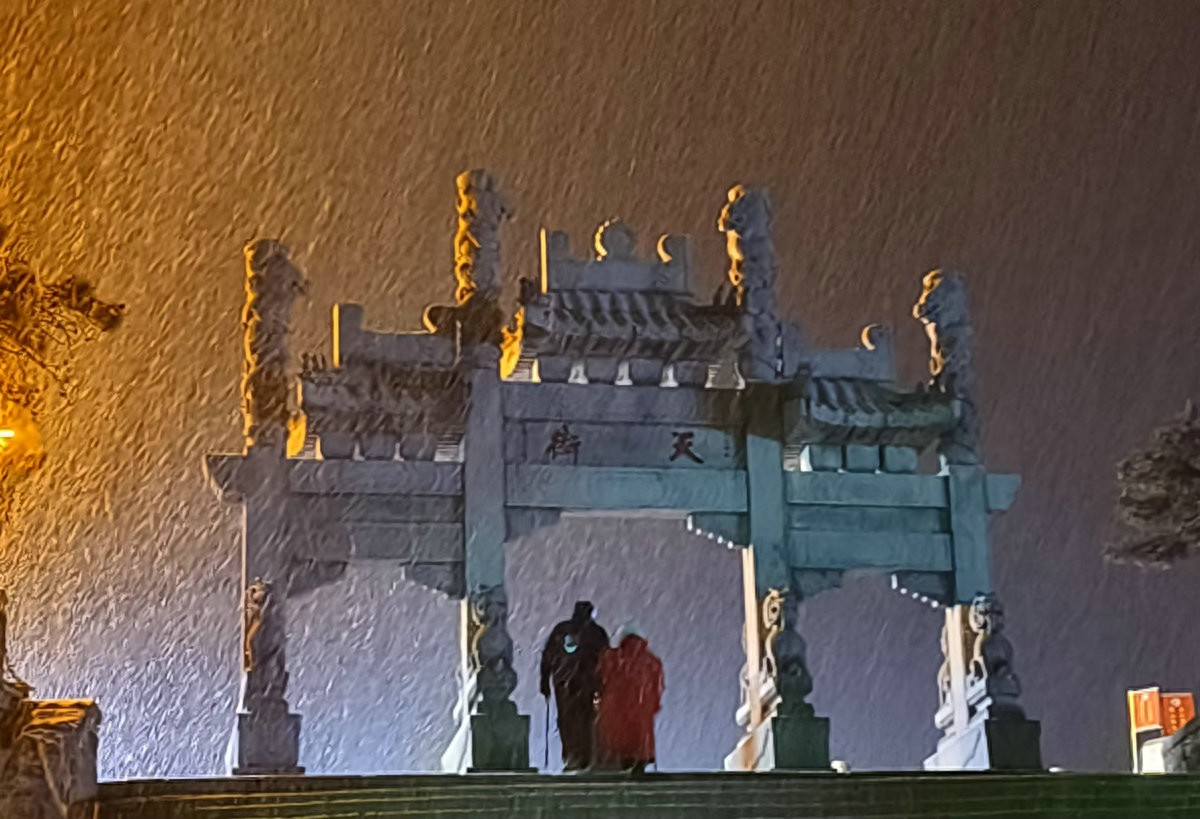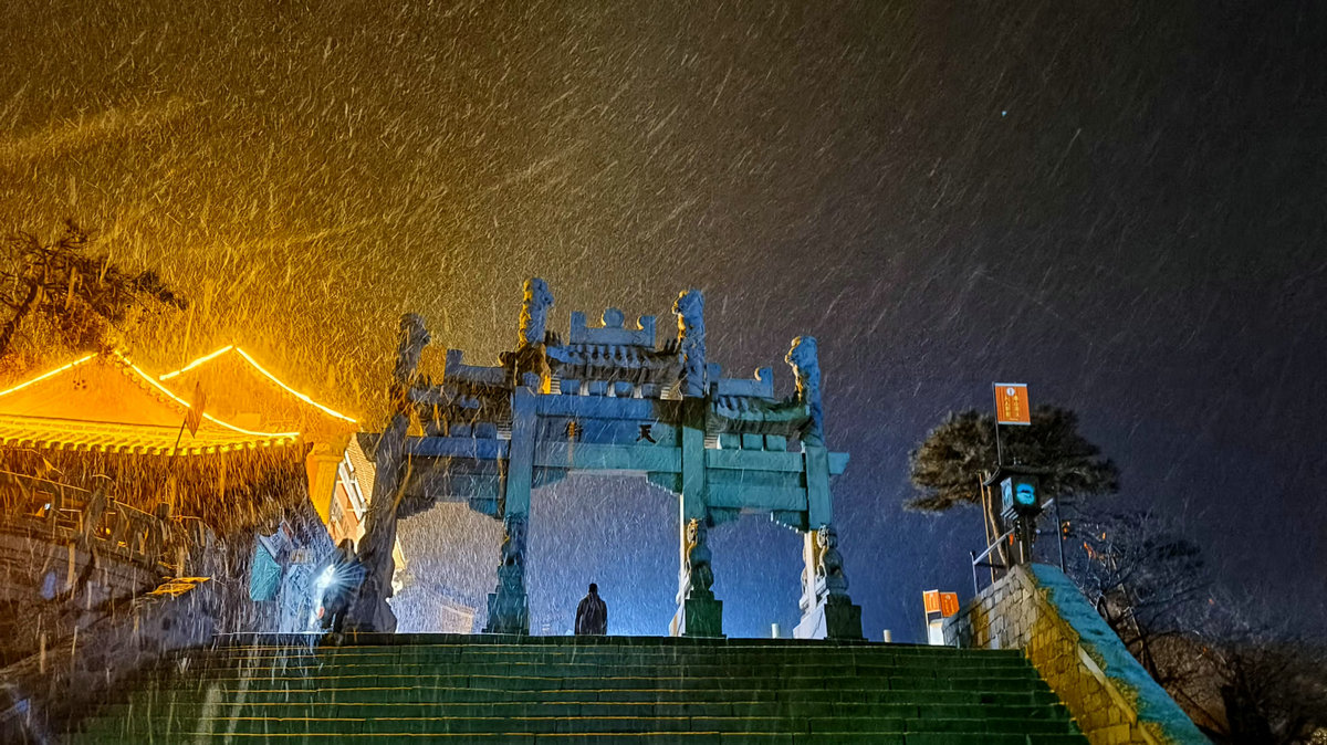 1月26日凌晨,山东泰安迎来了新年的第一场降雪,泰山被洁白的雪花悄然覆盖。纷纷扬扬的雪花在夜色中飞舞,给这座雄伟的名山增添了一份神秘而宁静的韵味。