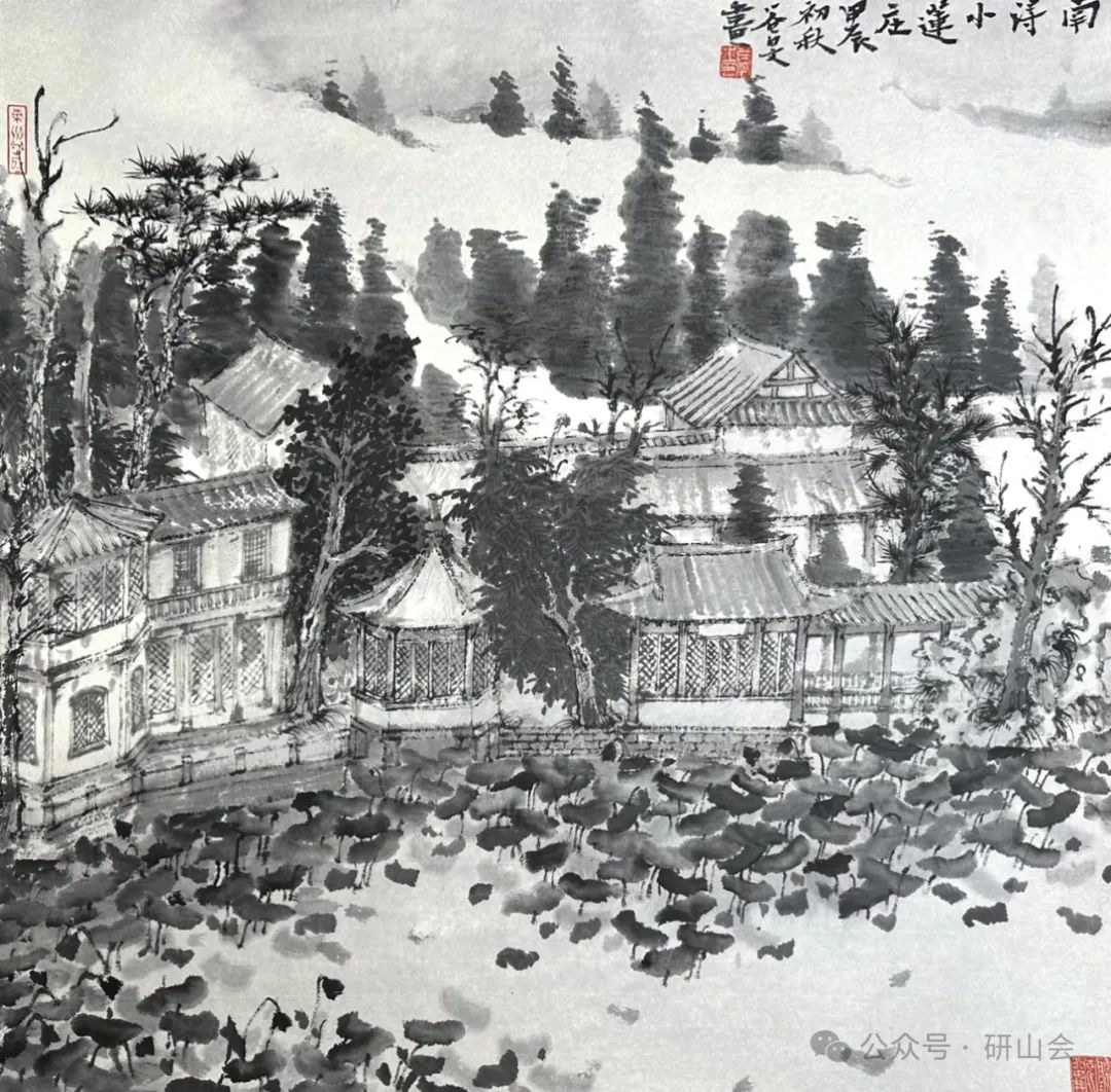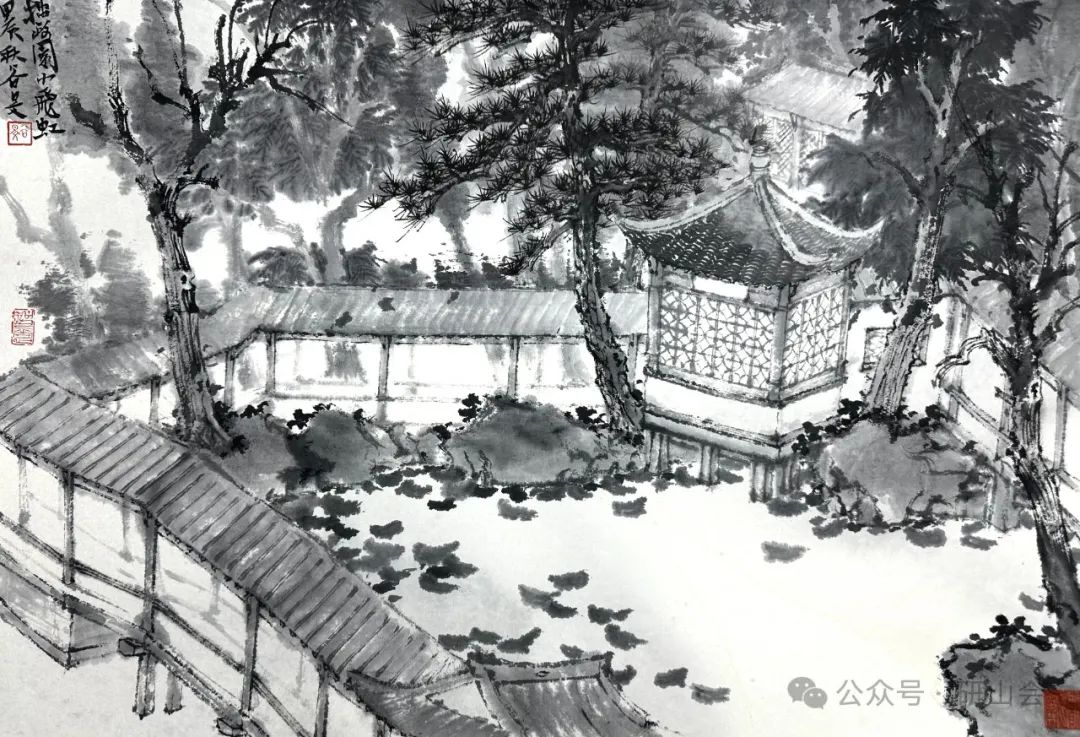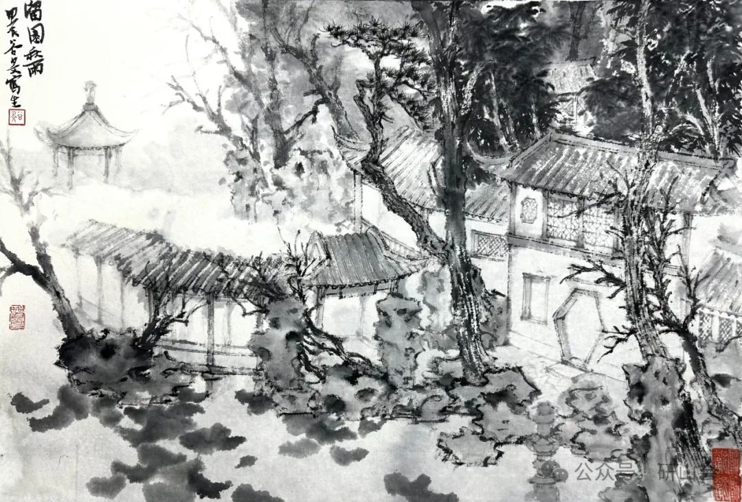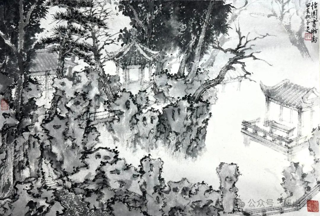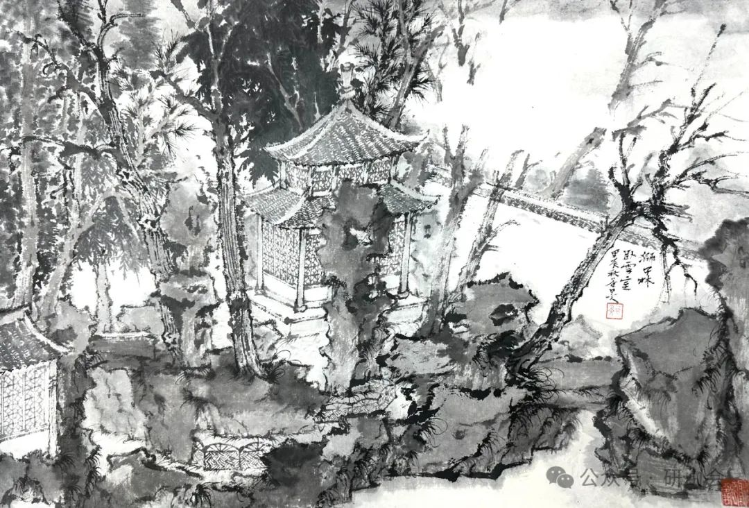能厚重也能清逸,厚重也兼空灵,是张谷旻笔墨的另一特点。《九华山系列》大多是厚重而空灵的。画林木烟岚墨气厚重,画院落房屋笔意幽淡。两方面形成对比,又和谐统《抱朴山庄》、《西泠印社》、《湖山清晓》、《山庄清凉》等扇面作品,以渴笔淡画西湖园林,结景严密,画法精致而淡雅,含倪云林之清逸而无其孤峭,近王蒙之毛厚而无其繁密。在山水写生(或写生性创作)中能如此自如地运用传统笔墨进行写生,是对现代中国画写生的一个超越。