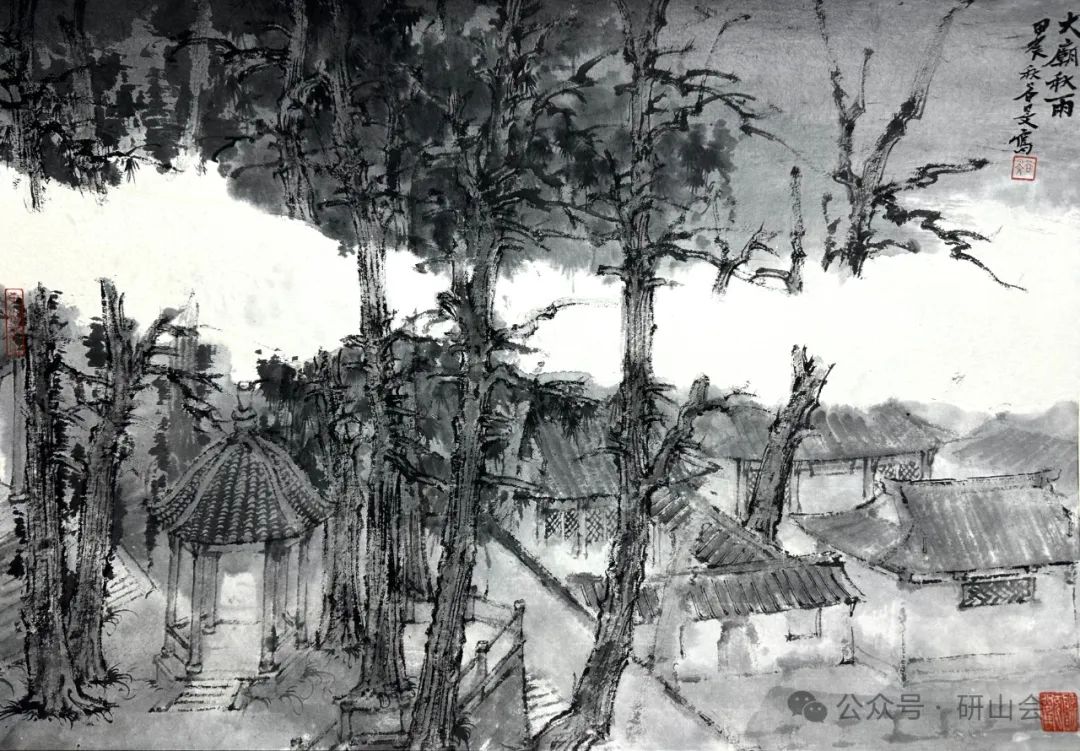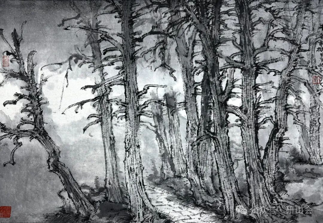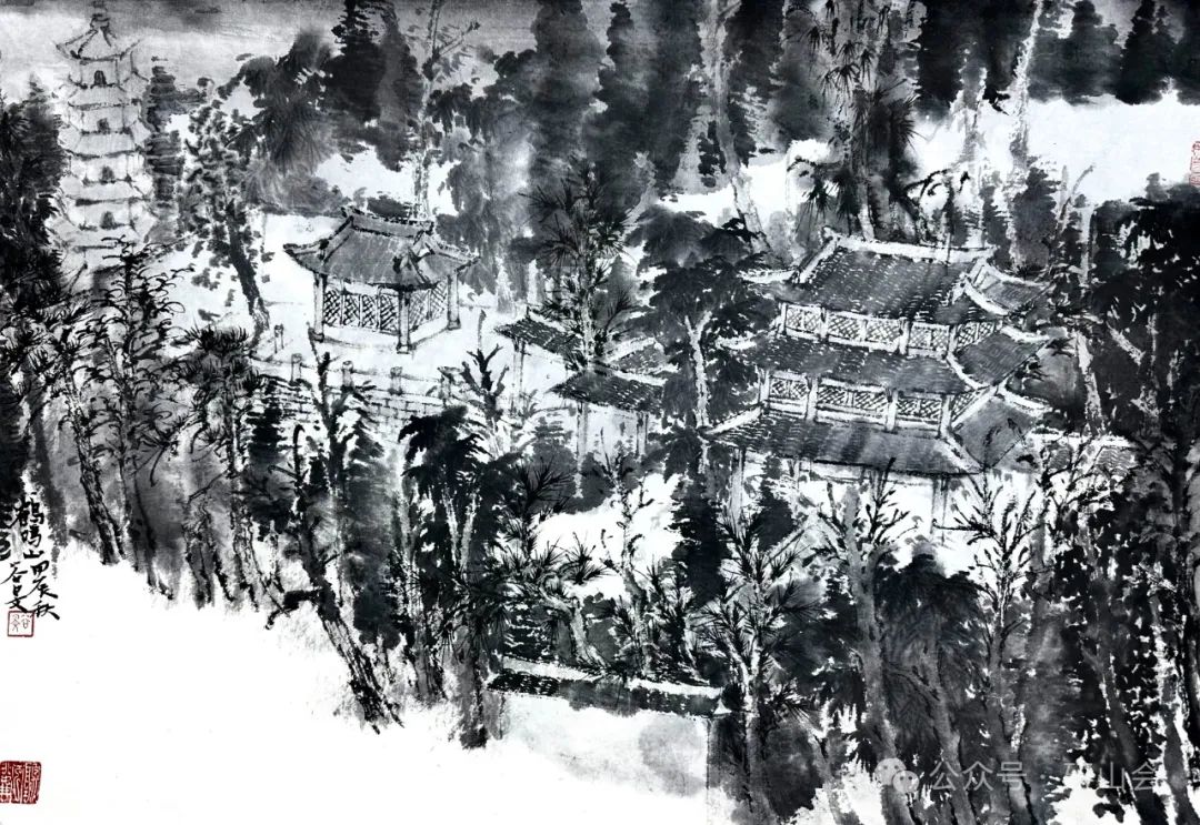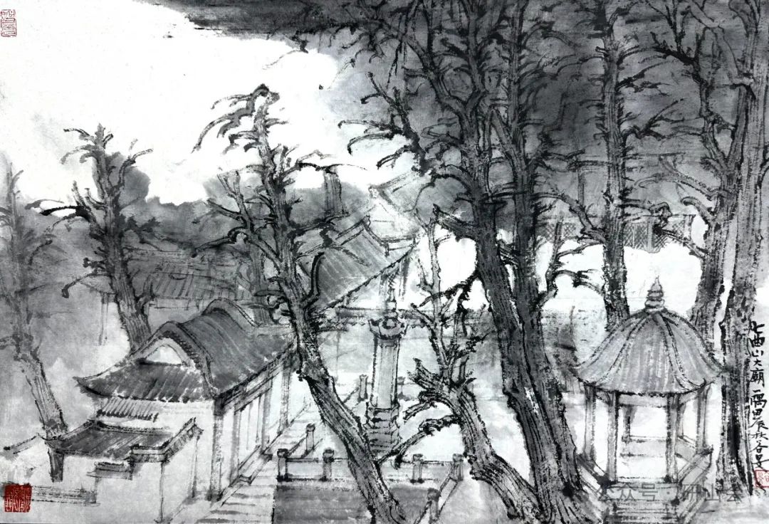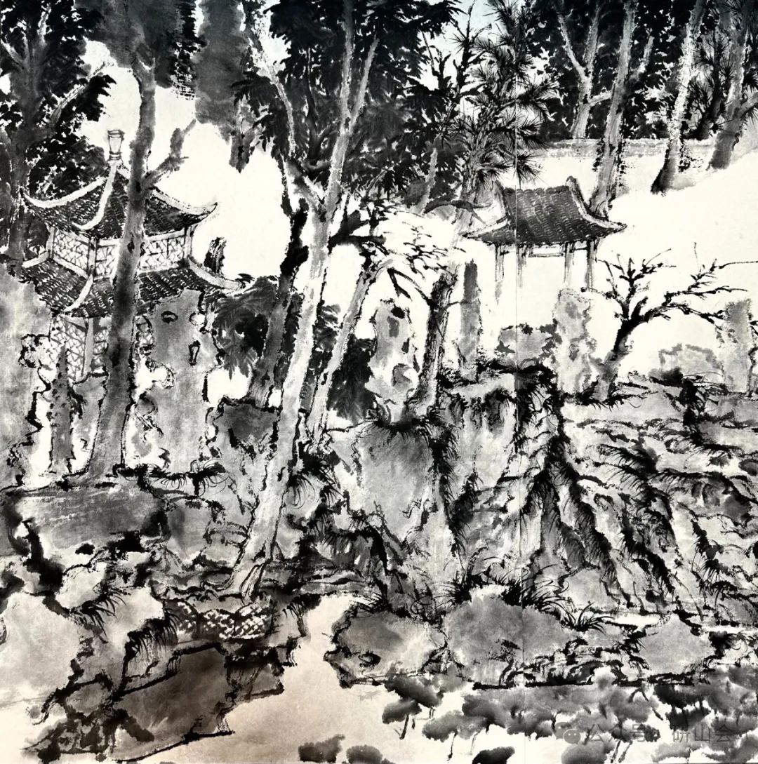 约1994年前,张谷旻一度迷恋西北景观,以细笔作大画,构筑奇雄神秘,具有宗教感的西部幻境。1994年后又转画江南,风格为之一变。所画九华禅寺、西湖园林或者古歙村寸居,大都岭岫出云,静无人迹,也没有鸟飞与风动,似乎是对烟雨江南的幽寂凝视。笔法沉实,风格以浑厚为基调,内含清峻。墨色滋润而有枯涩,晴光明灭,苍翠欲滴。概言之,其笔墨可用笔随形运、墨从笔变、笔骨墨韵、相得益彰来概括。他重视笔墨与形象的统一,拒绝将笔墨与形象造境割裂开的“线条游戏”,但他的笔墨又不仅是造型工具,而仍有独立于造型之处的表现性。