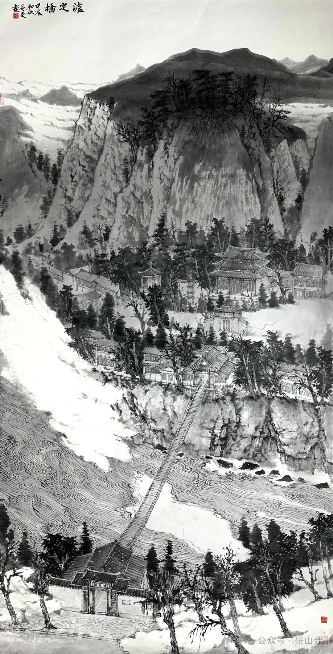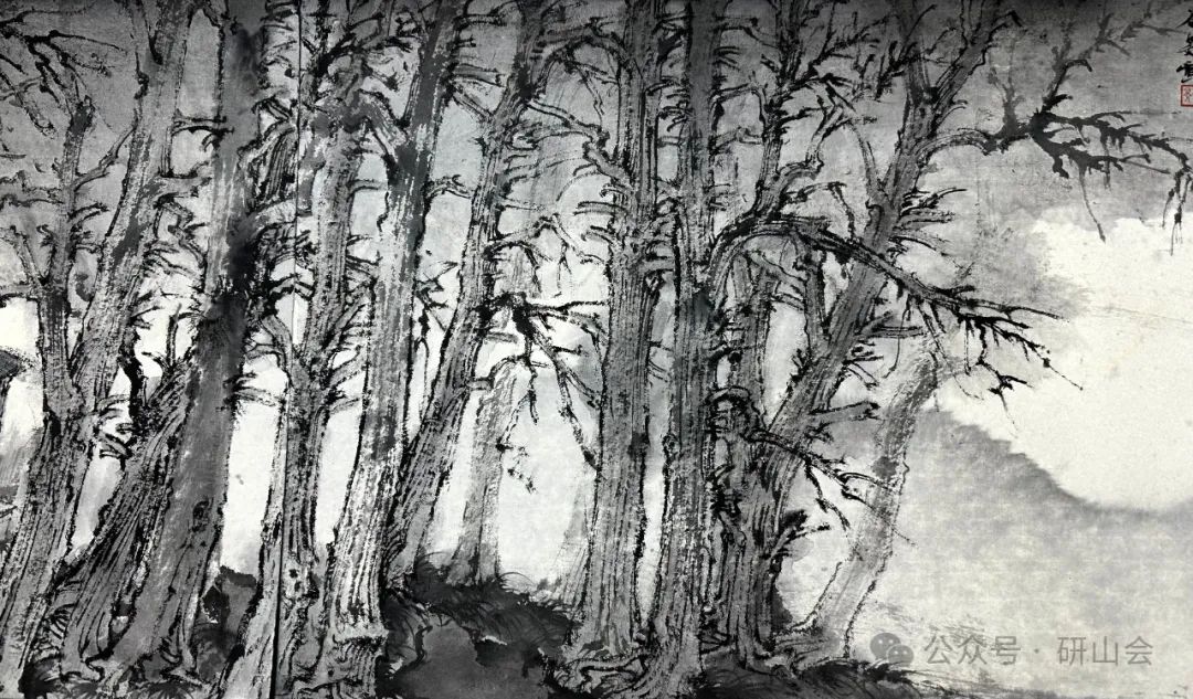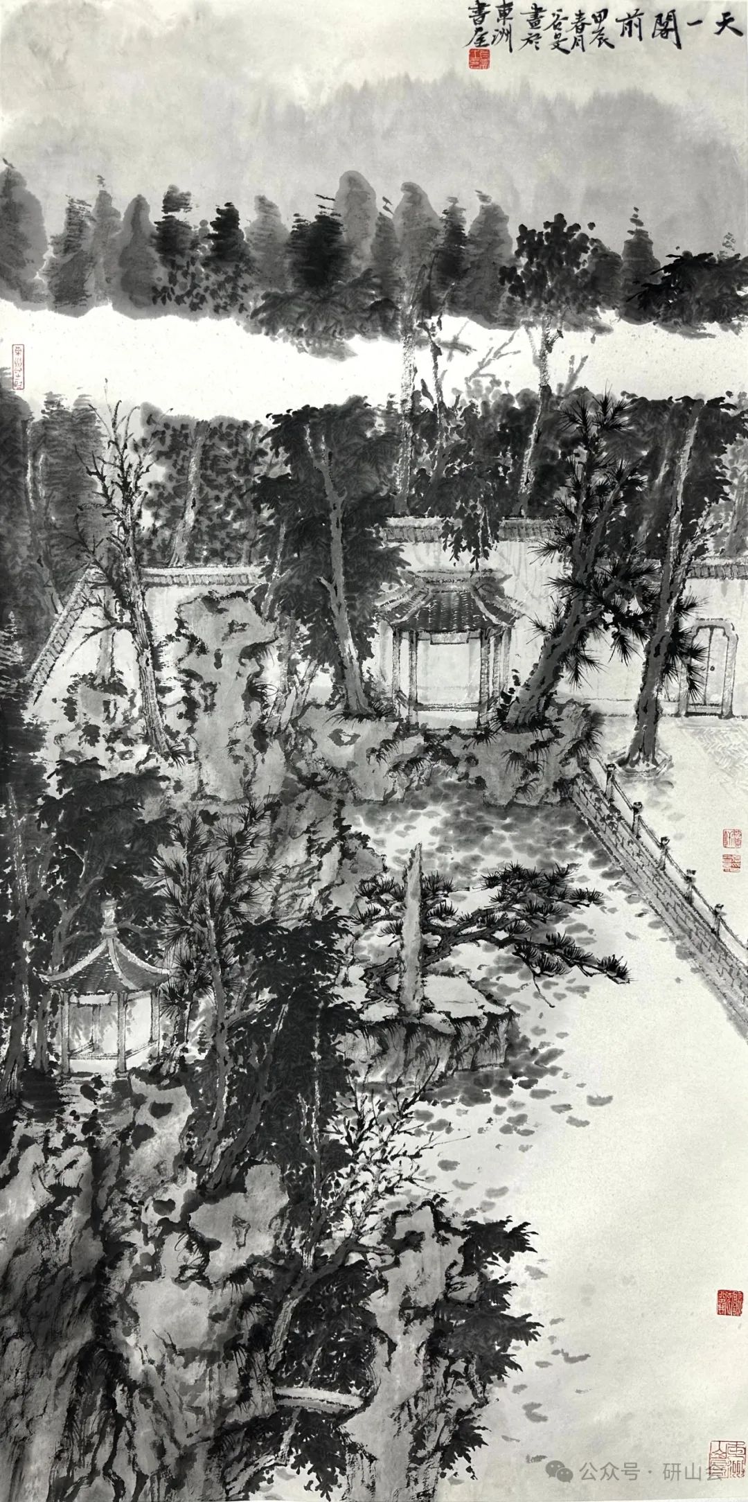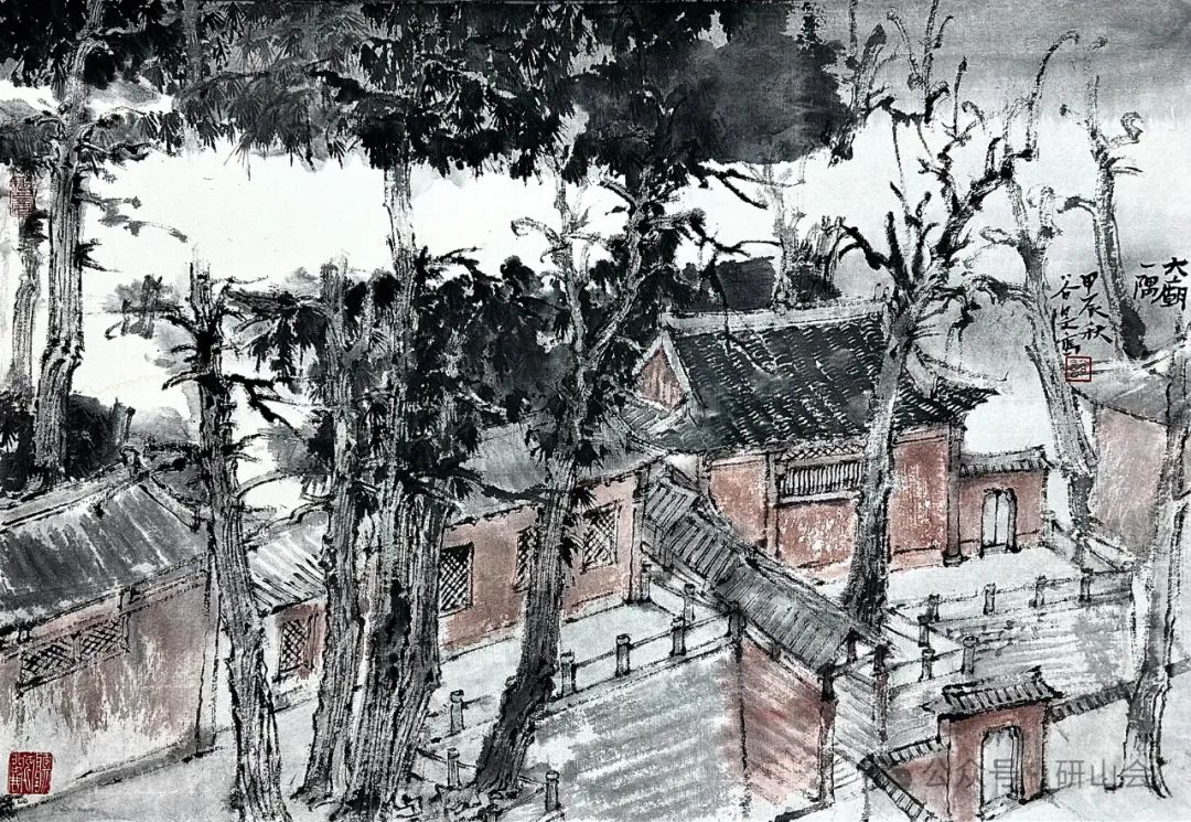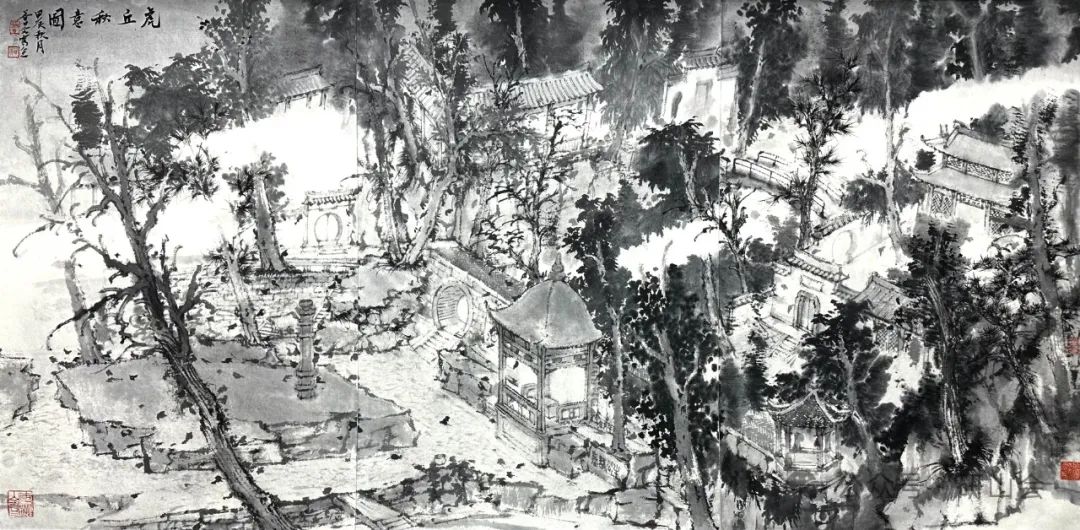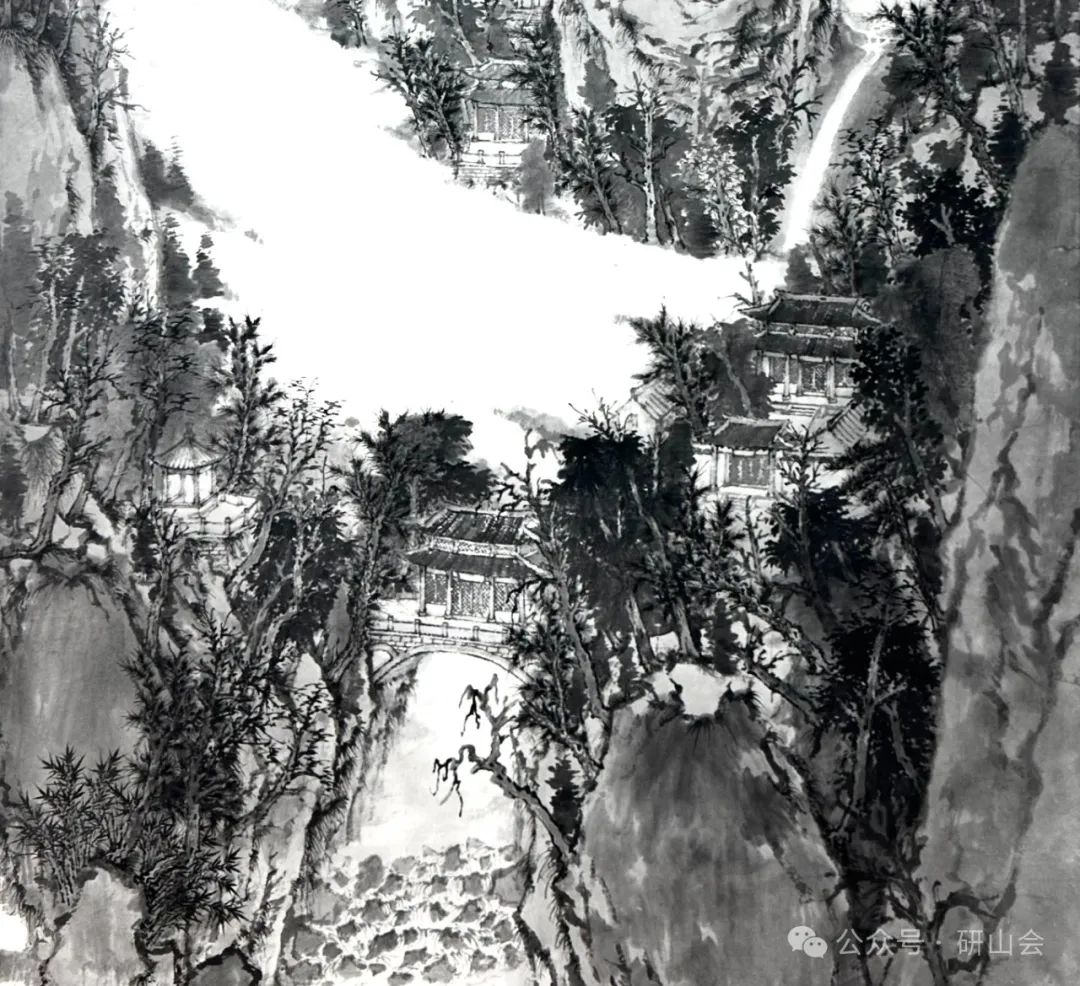 约1994年前,张谷旻一度迷恋西北景观,以细笔作大画,构筑奇雄神秘,具有宗教感的西部幻境。1994年后又转画江南,风格为之一变。所画九华禅寺、西湖园林或者古歙村寸居,大都岭岫出云,静无人迹,也没有鸟飞与风动,似乎是对烟雨江南的幽寂凝视。笔法沉实,风格以浑厚为基调,内含清峻。墨色滋润而有枯涩,晴光明灭,苍翠欲滴。概言之,其笔墨可用笔随形运、墨从笔变、笔骨墨韵、相得益彰来概括。他重视笔墨与形象的统一,拒绝将笔墨与形象造境割裂开的“线条游戏”,但他的笔墨又不仅是造型工具,而仍有独立于造型之处的表现性。