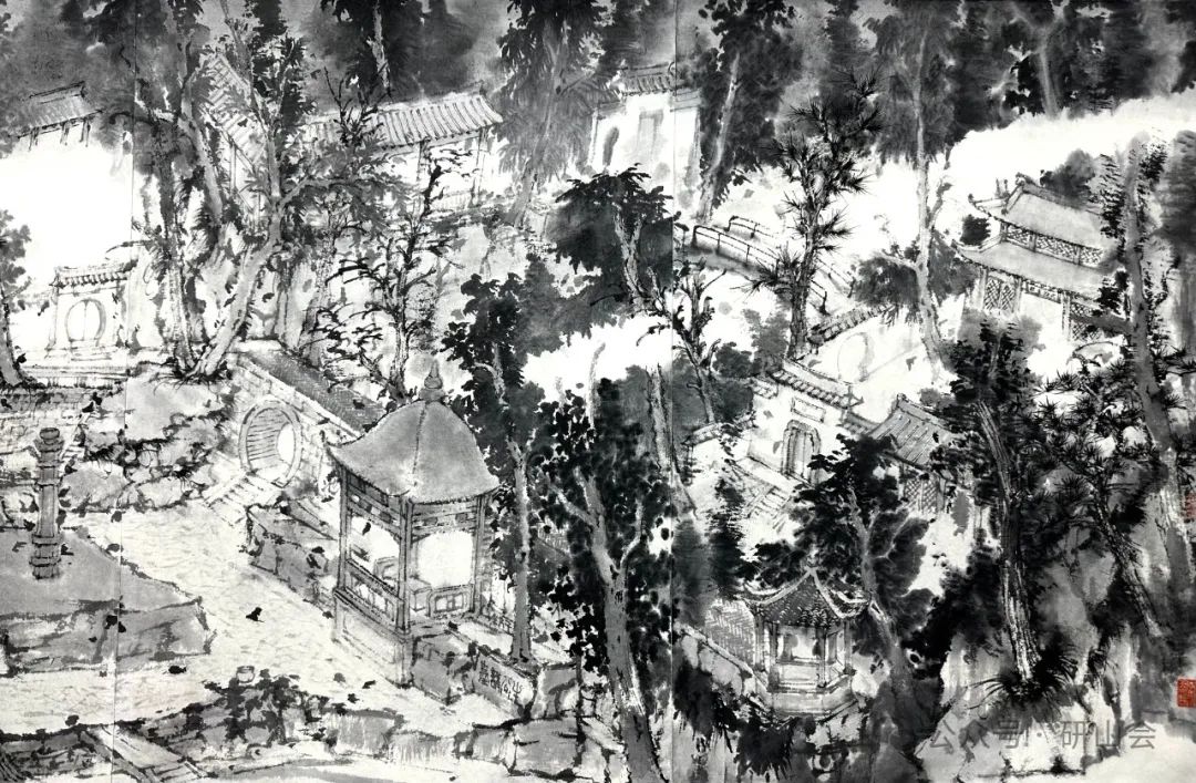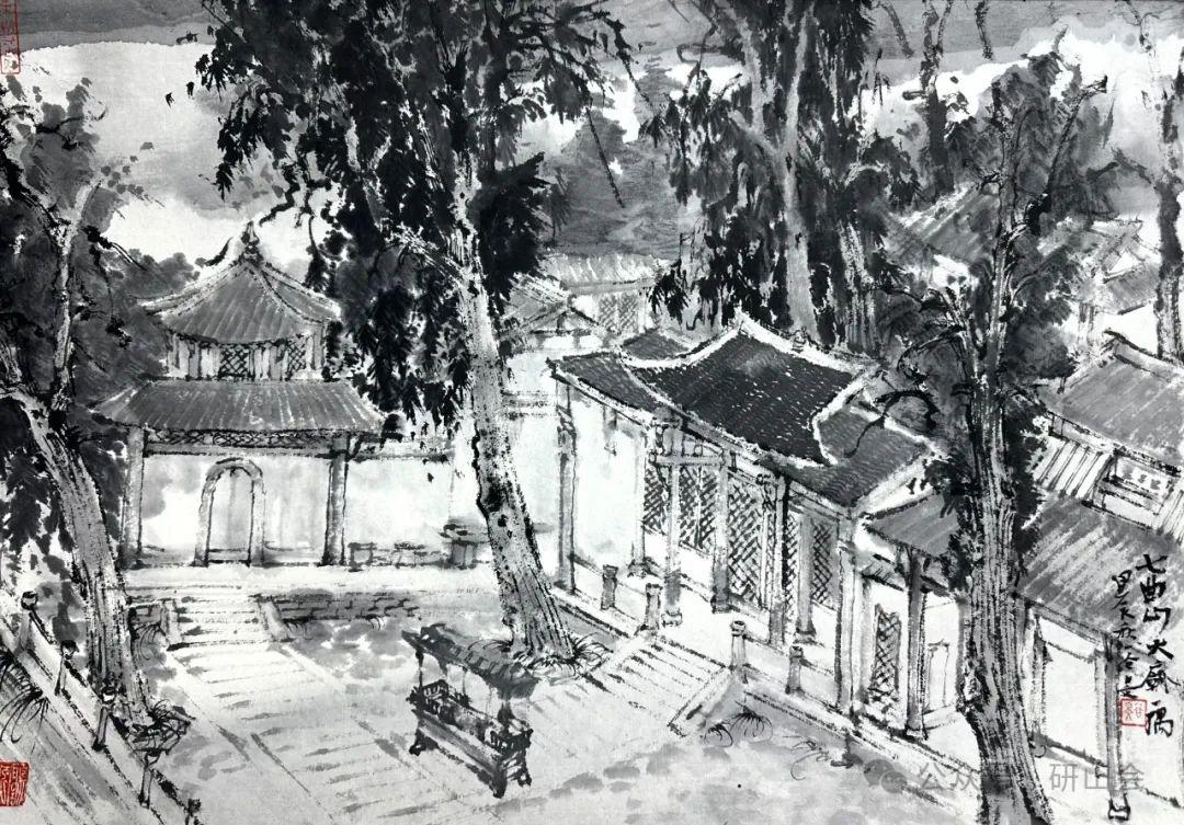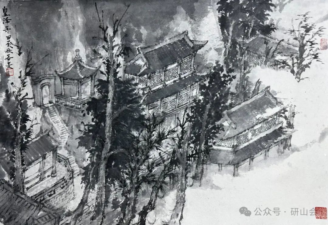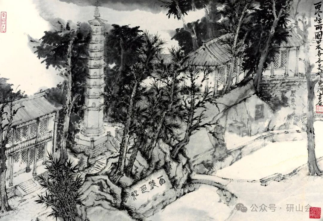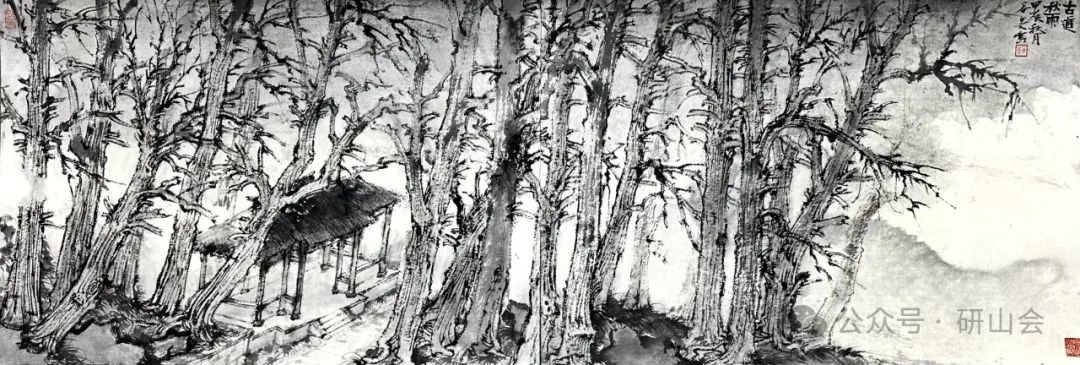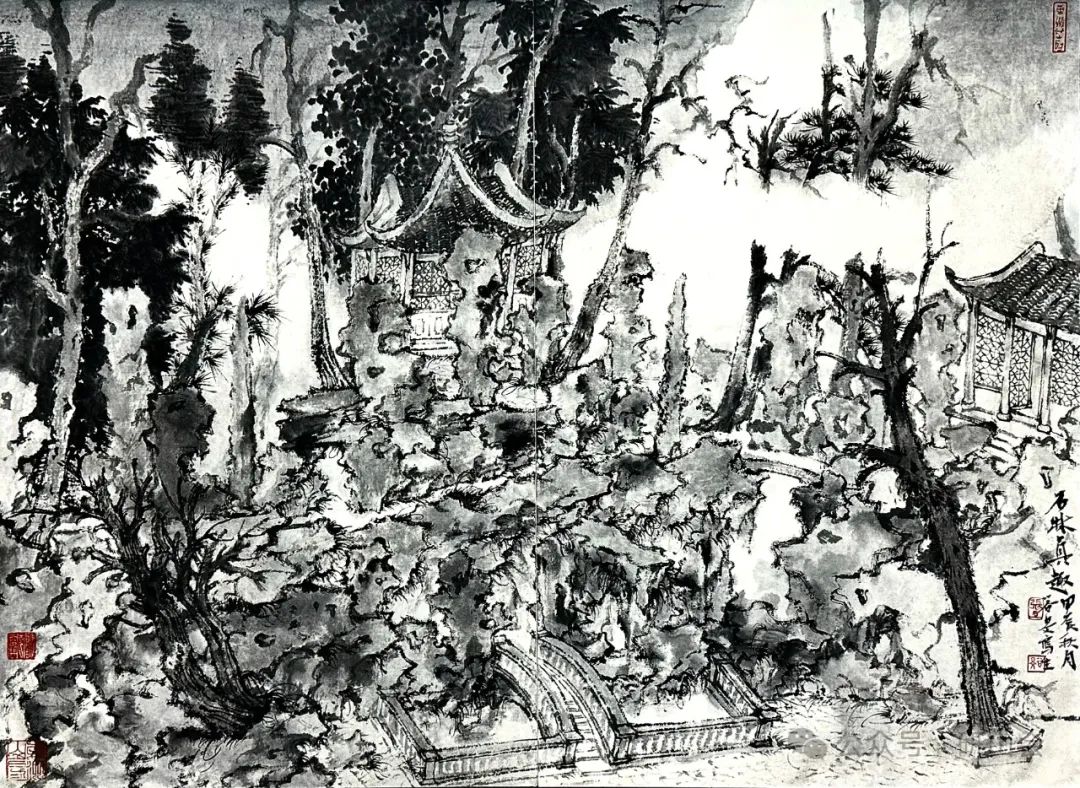 约1994年前,张谷旻一度迷恋西北景观,以细笔作大画,构筑奇雄神秘,具有宗教感的西部幻境。1994年后又转画江南,风格为之一变。所画九华禅寺、西湖园林或者古歙村寸居,大都岭岫出云,静无人迹,也没有鸟飞与风动,似乎是对烟雨江南的幽寂凝视。笔法沉实,风格以浑厚为基调,内含清峻。墨色滋润而有枯涩,晴光明灭,苍翠欲滴。概言之,其笔墨可用笔随形运、墨从笔变、笔骨墨韵、相得益彰来概括。他重视笔墨与形象的统一,拒绝将笔墨与形象造境割裂开的“线条游戏”,但他的笔墨又不仅是造型工具,而仍有独立于造型之处的表现性。